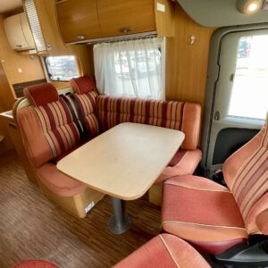 Auton etuosassa on viihtyisä L- pöytäryhmä lyhyellä sivusohvalla. Kääntyvien etuistuinten ansiosta pöydän ympärille mahtuu kivasti kuusikin henkilöä menneitä muistelemaan.