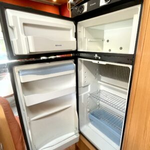 Keskeltä autoa löytyy L- keittiö, jonka varustukseen kuuluu ison jääkaappi- pakastimen lisäksi kaasu- uuni.
