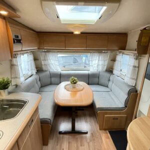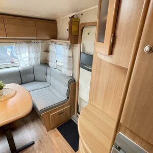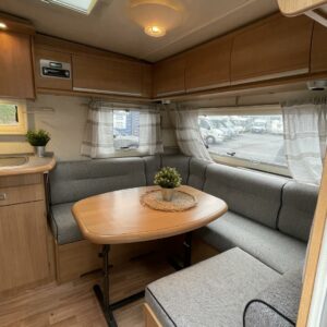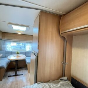 Edessä avara U-pöytäryhmä, joska sijattavissa suureksi parivuoteeksi. Pitkittäinen parivuode takana, jonka vieressä tilava wc- tila. Keskellä keittiö.