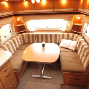 Avara vaunu leveällä parivuoteella vaikka ympärivuotiseen käyttöön. Edessä valoisa U-istuinryhmä, joka sijattavissa vuoteeksi.