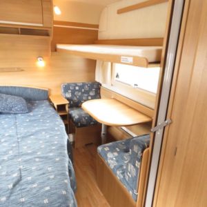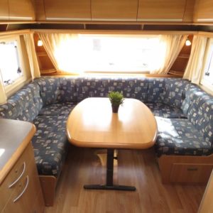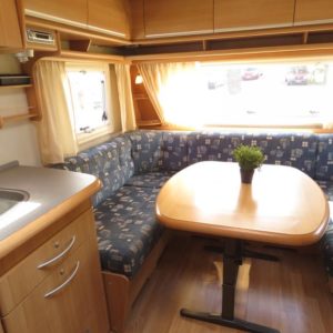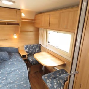 Toimiva pohjaratkaisu; Vaunun takaosassa muhkea parivuode ja pieni pöytäryhmä. Pöytäryhmän yläpuolella oleva kaappi mahdollista kääntää varavuoteeksi. Vaunun etuosasta löytyy viihtyisä U- ryhmä.