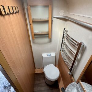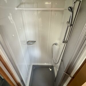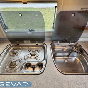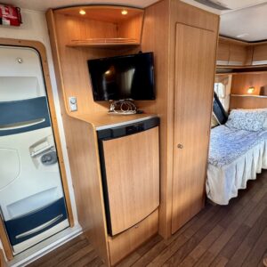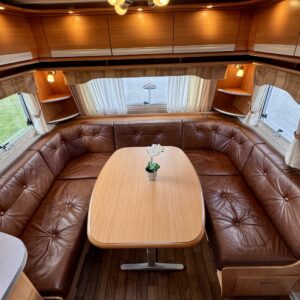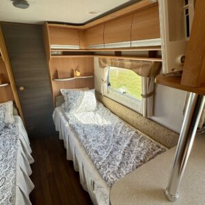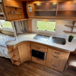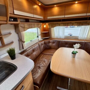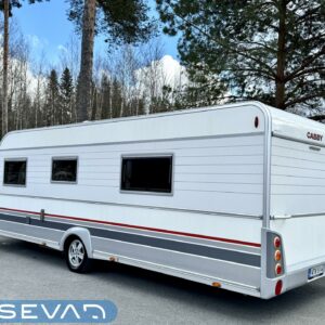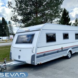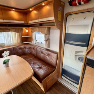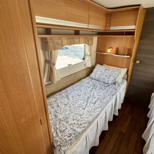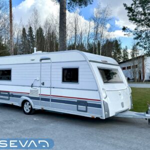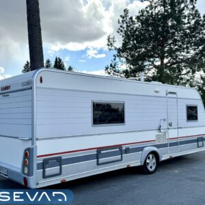 Pohjoismaista laatutyötä pohjoismaisiin olosuhteisiin suunniteltuna ja rakennettuna. Luonnollisesti Aldella varustettuna, eli pärjäilee talvikelissäkin ilman vilunväristyksiä. Ja onhan tässä vastavuoroisesti valmiiksi asennettuna ilmastointi torjumaan hellekelien mahdollisilta lämpöhalvauksilta. Vaunun takaosasta löytyy koko vaunun levyinen kylppäritila erillisellä suihkutilalla. Eteenpäin siirryttäessä saavumme makkariin missä odottelee mukavat erillisvuoteet. Molempien vuoteiden alla on hyvin säilytytiloja tavaroille. Etuosa on tupakeittiötyylinen, eli etuosan U-ryhmä on yhtä isoa tilaa keittiön kanssa. U-ryhmästä saadaan tarvittaessa sijattua vuode kahdelle henkilölle. Keittiötasolta löytyy kivasti laskutilaa vaikkapa kahvinkeittimelle. Keittiössä perusvarustuksen lisänä mikro. Siistikuntoinen kokonaisuus.