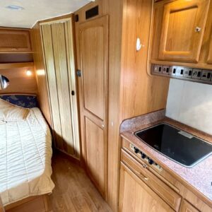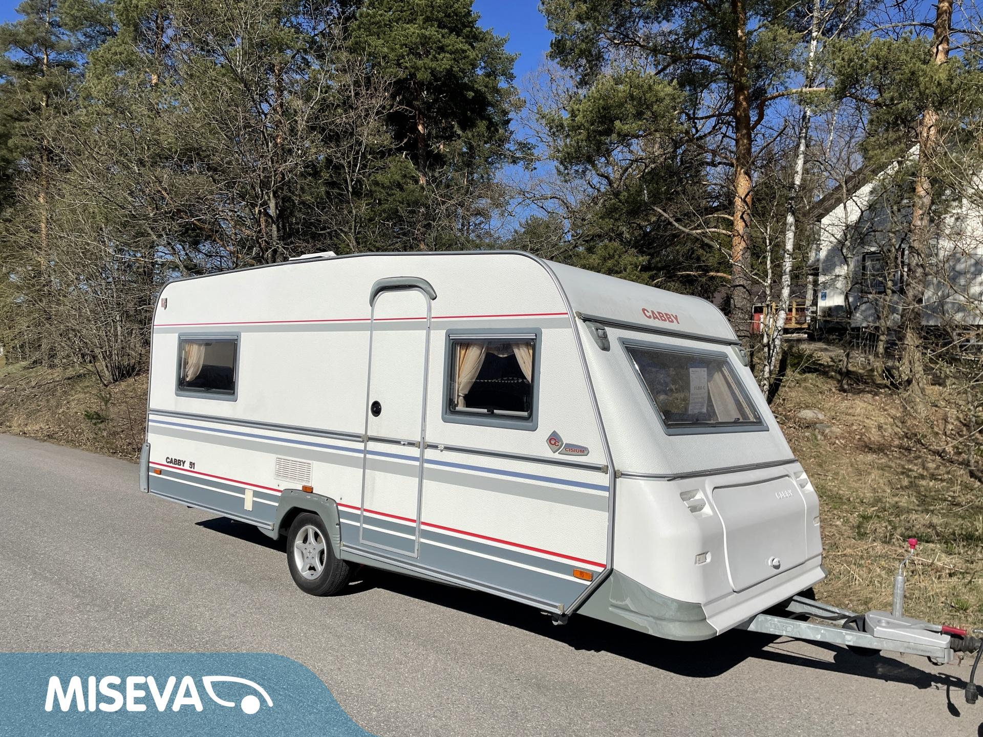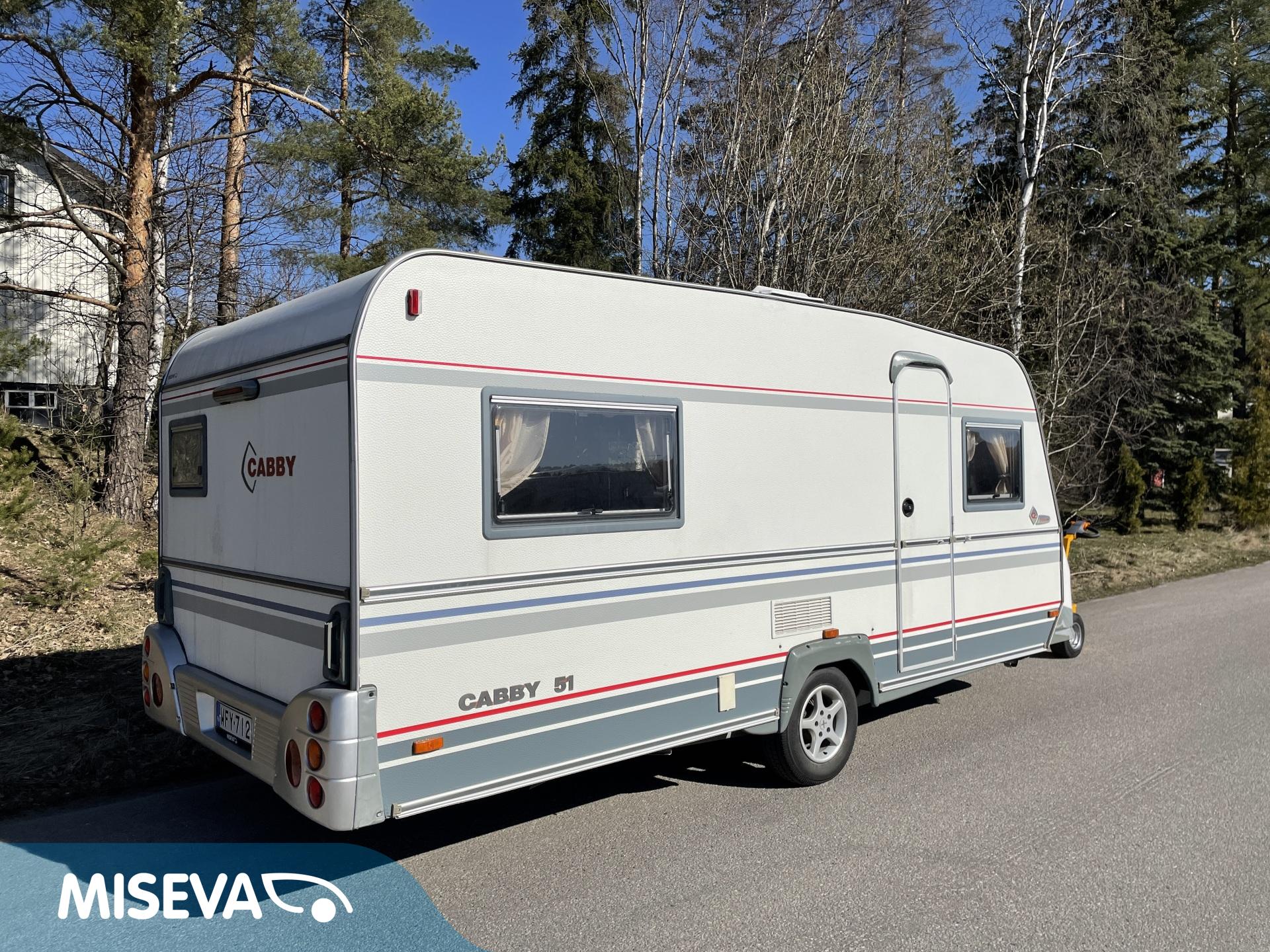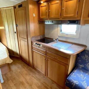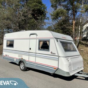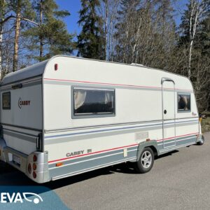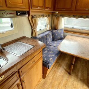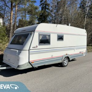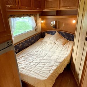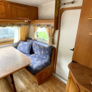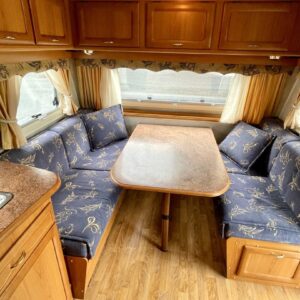 Vaunun takaosassa pitkittäinen parivuode ja pesuhuone/ WC, etuosasta löytyy pöytäryhmä joka sijattavissa toiseksi parivuoteeksi.