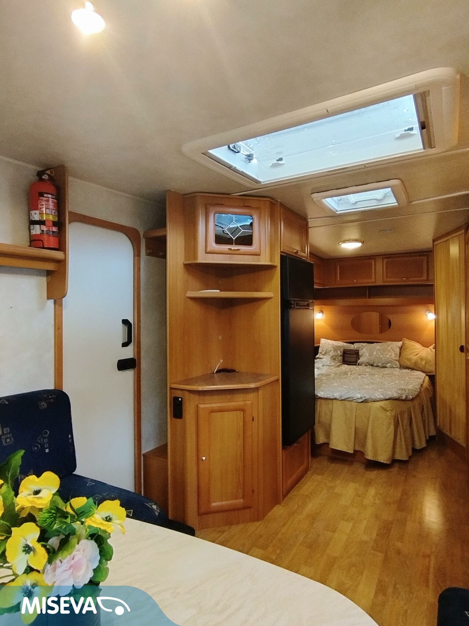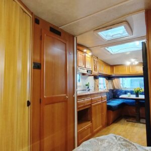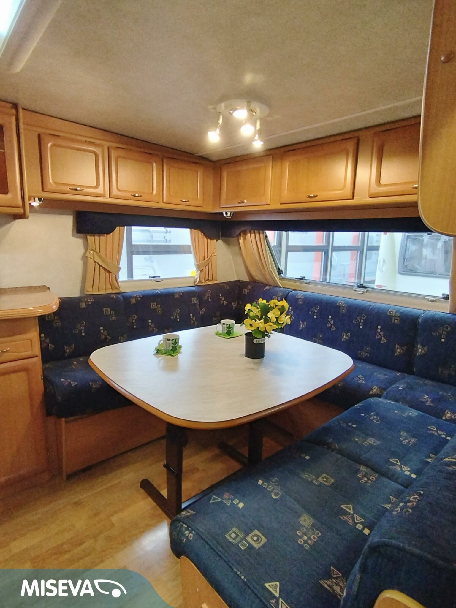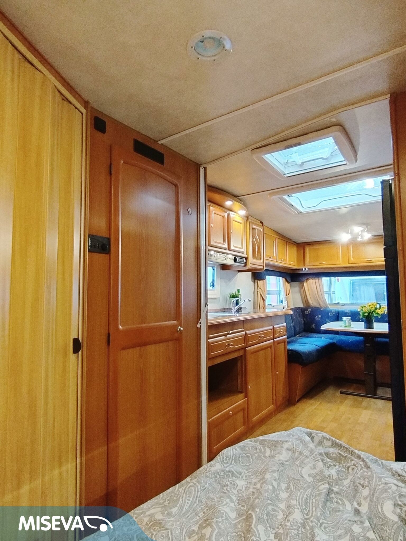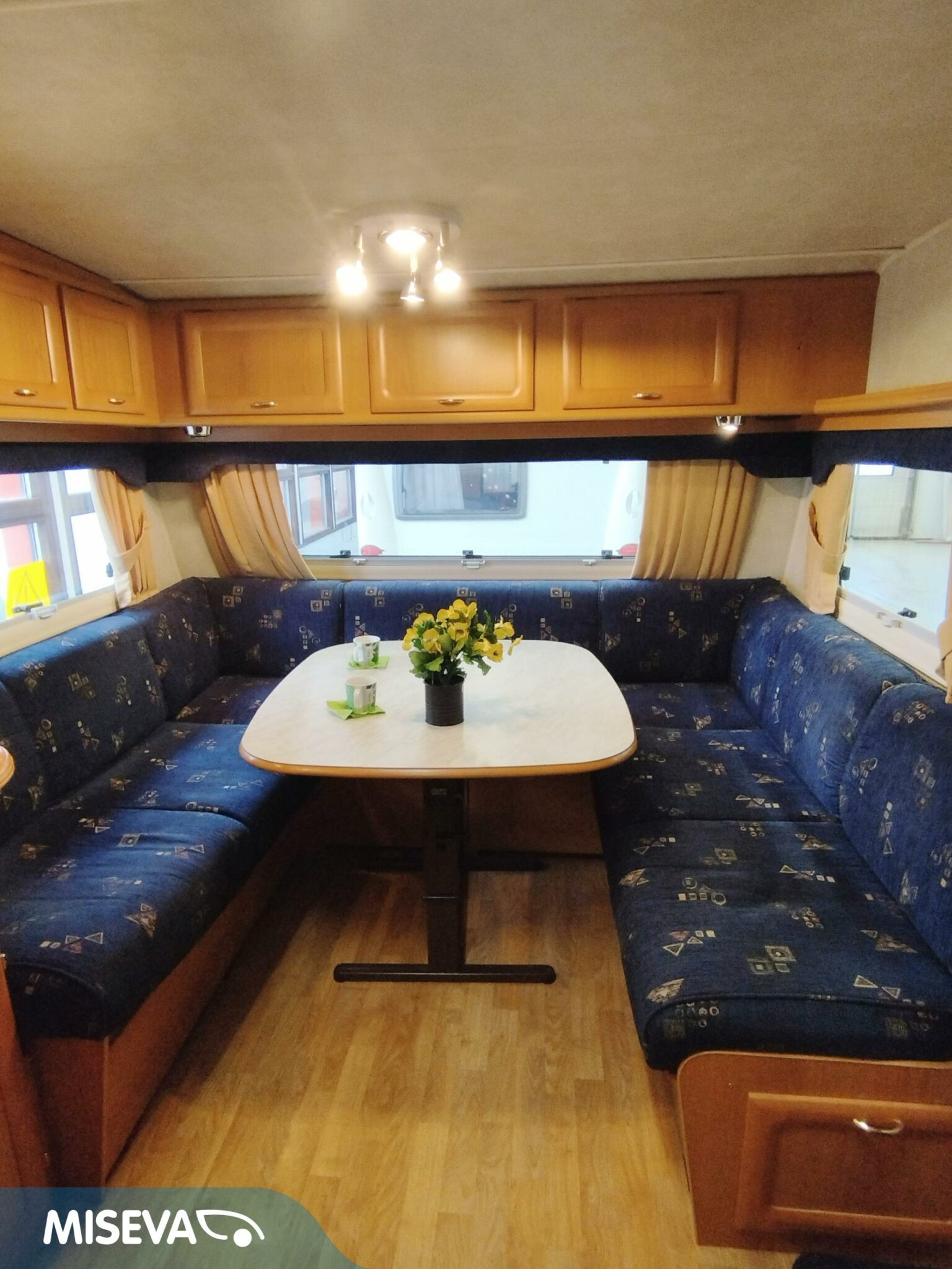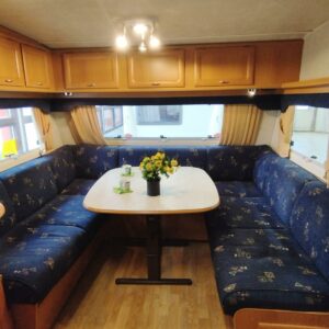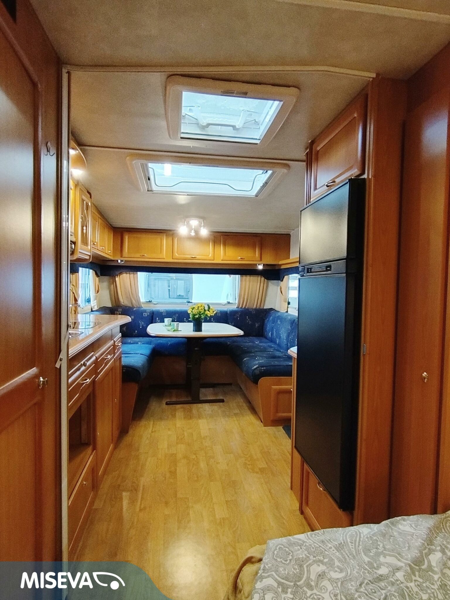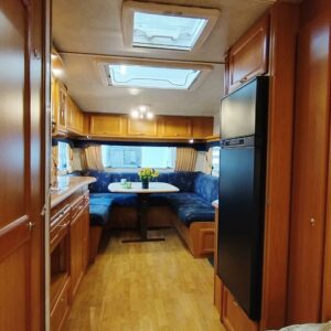 Edessä tilava U-ryhmä mistä saa sijattua vuoteen kahdelle henkilölle. Keskellä avara keittio normaalilla keittiövarustuksella ja isolla jääkaapilla. Takana pitkittäinen parivuode ja WC/kylpyhuonetilat.