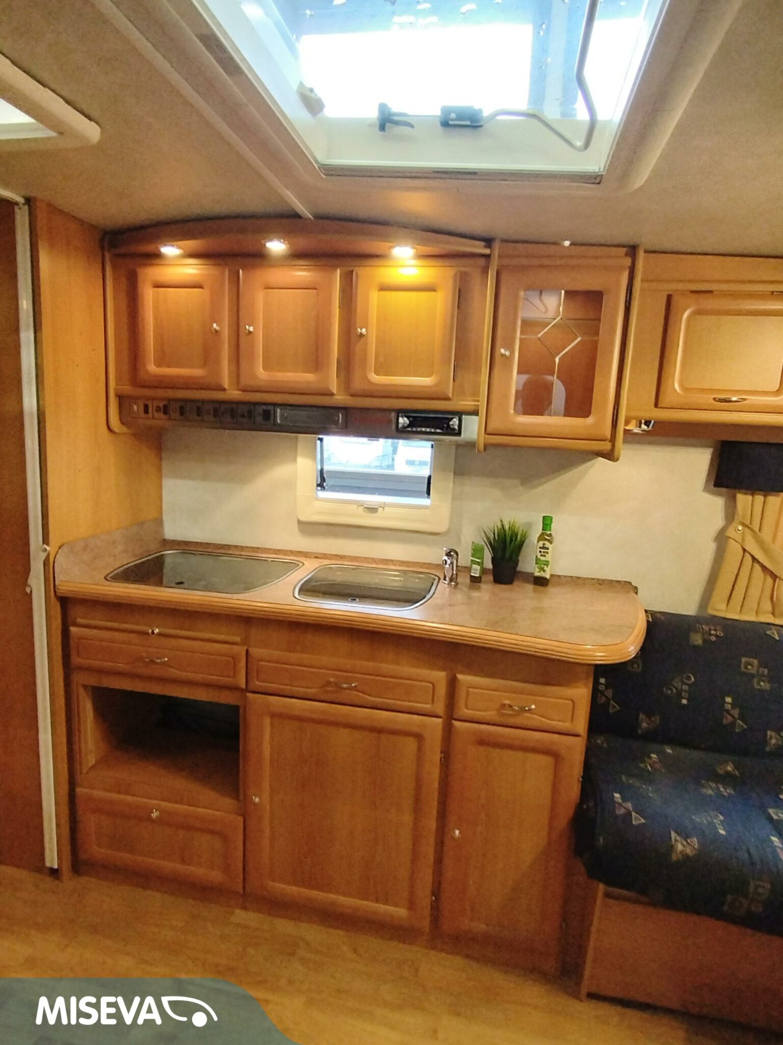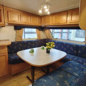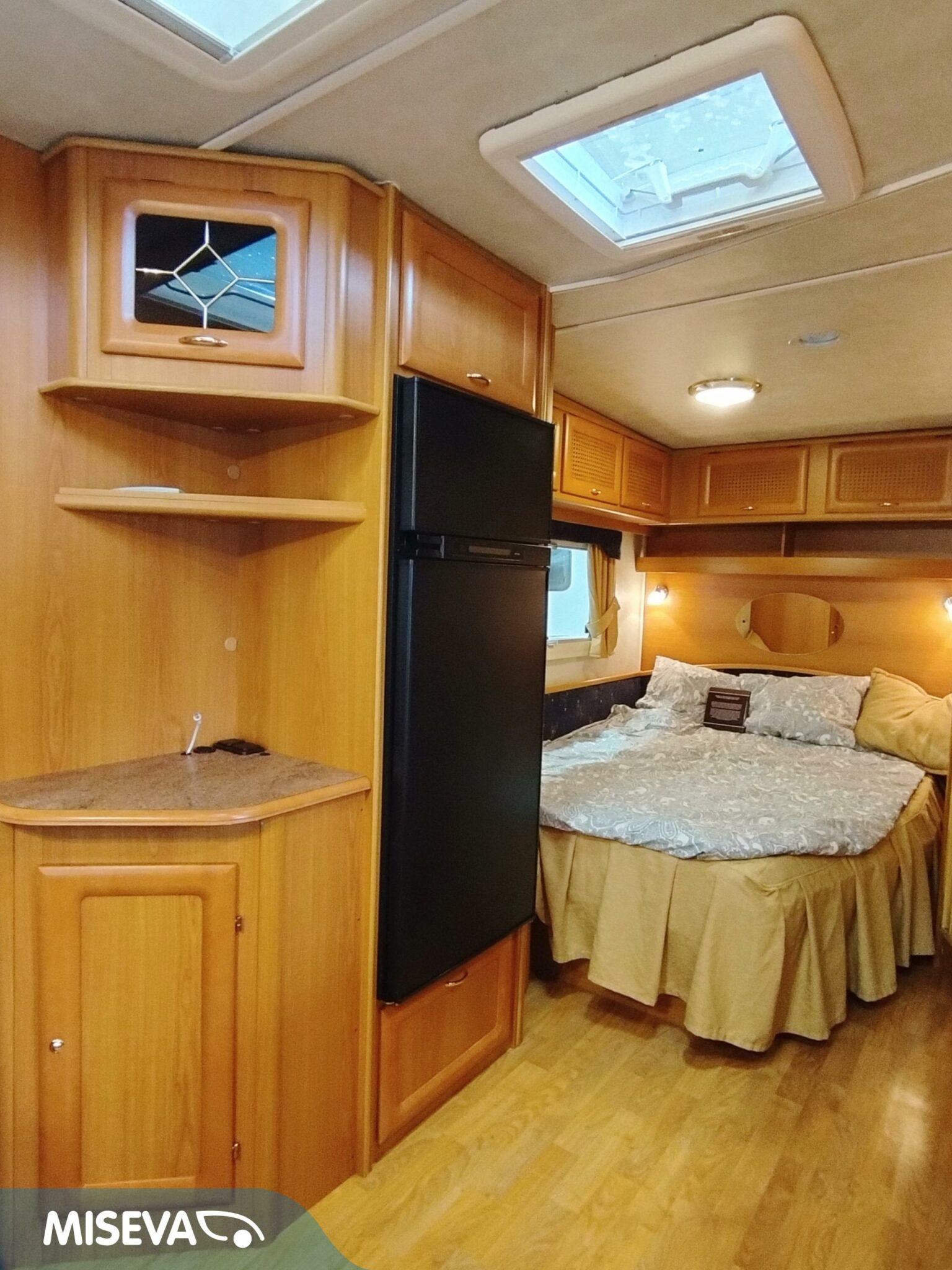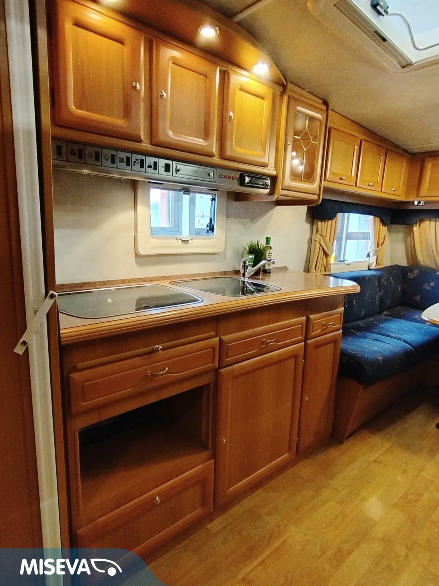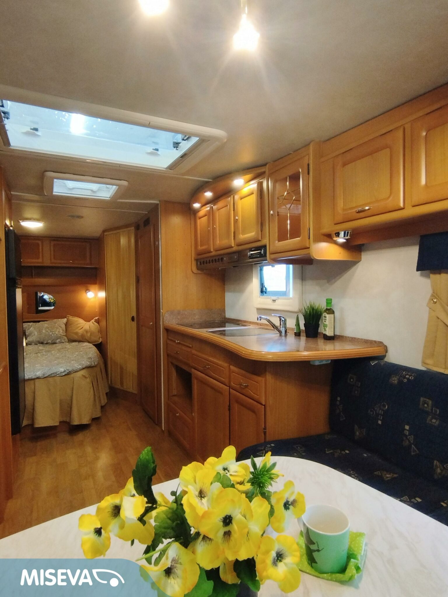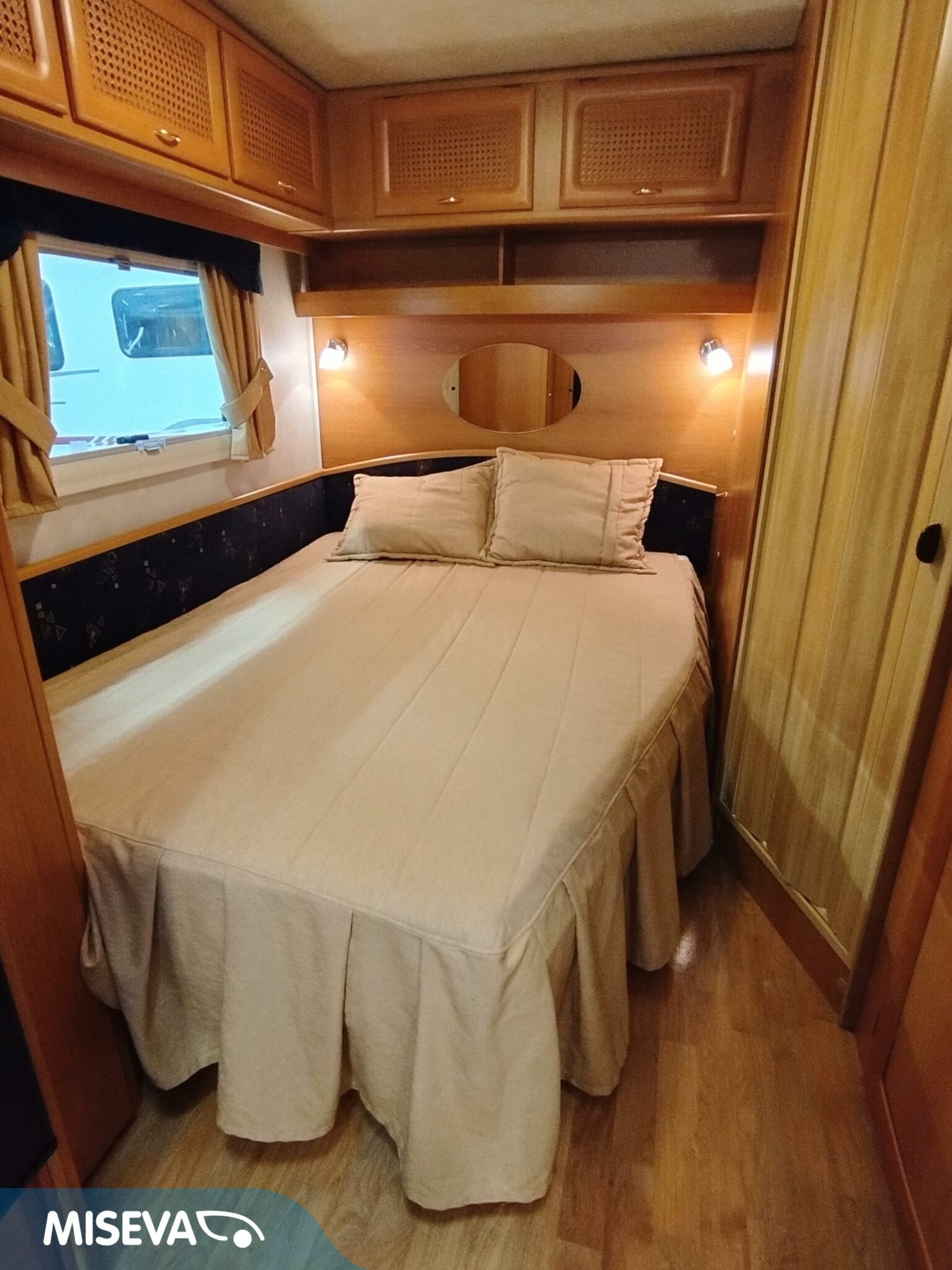 Edessä tilava U-ryhmä mistä saa sijattua vuoteen kahdelle henkilölle. Keskellä avara keittio normaalilla keittiövarustuksella ja isolla jääkaapilla. Takana pitkittäinen parivuode ja WC/kylpyhuonetilat.