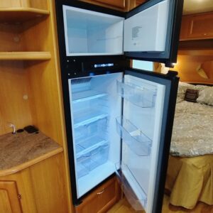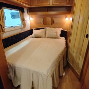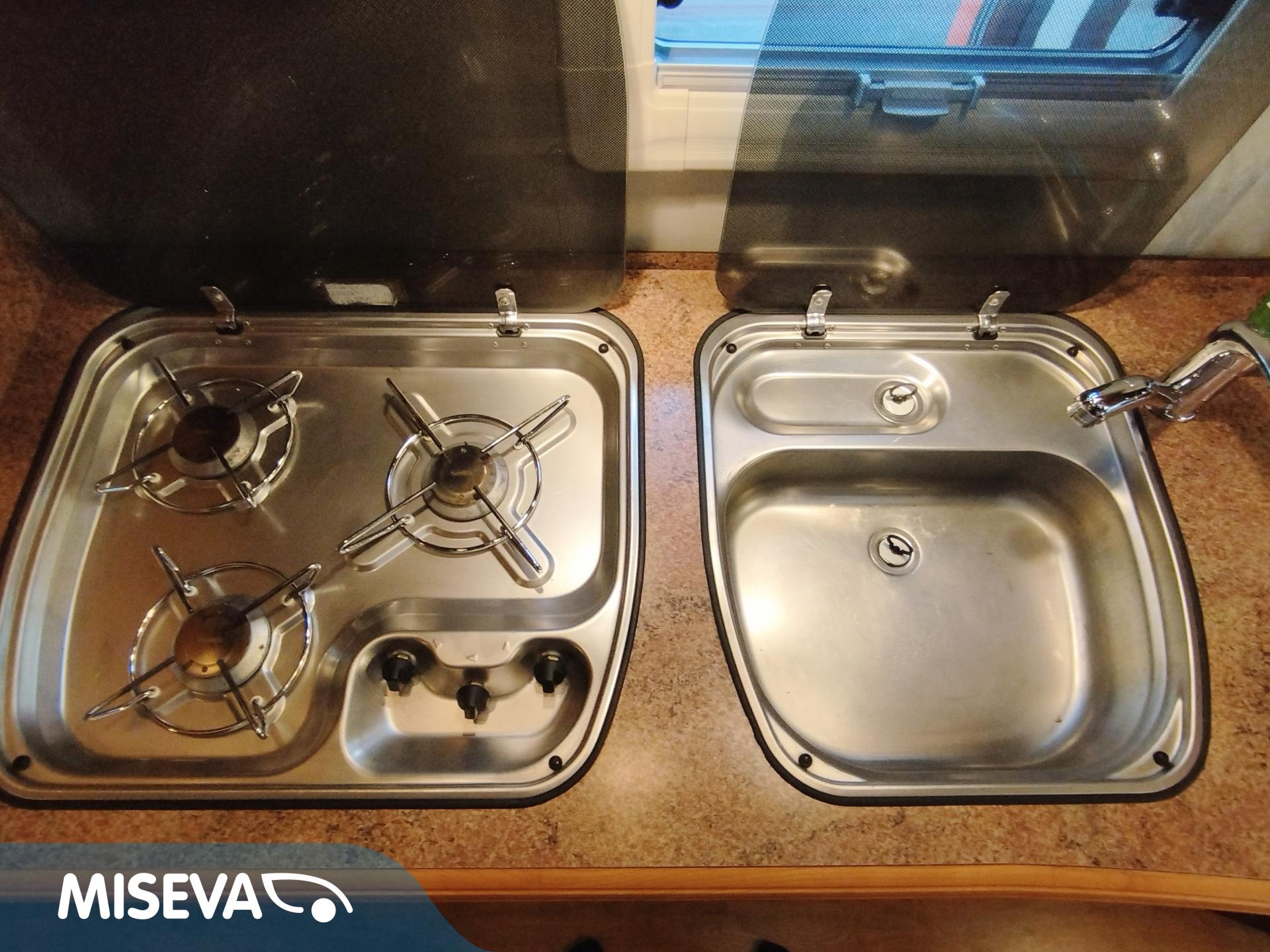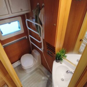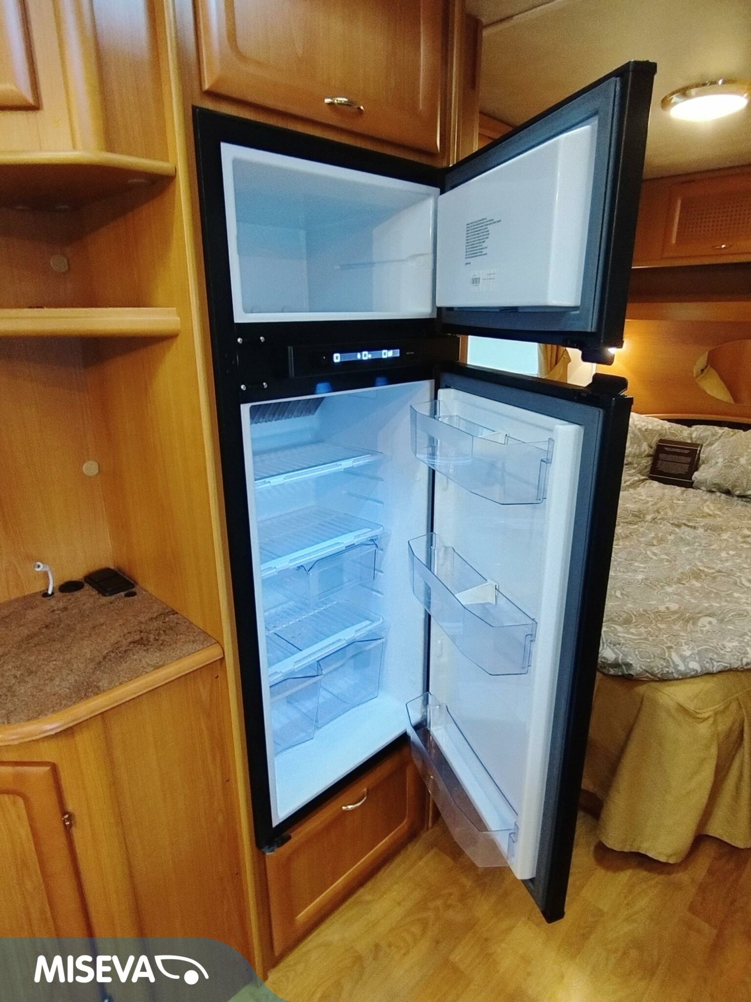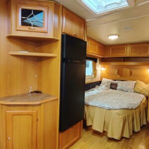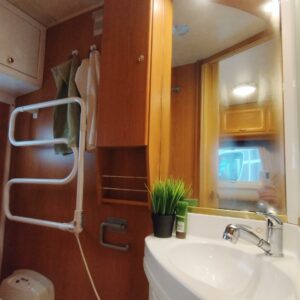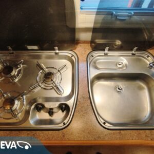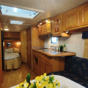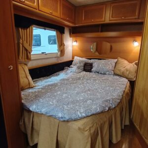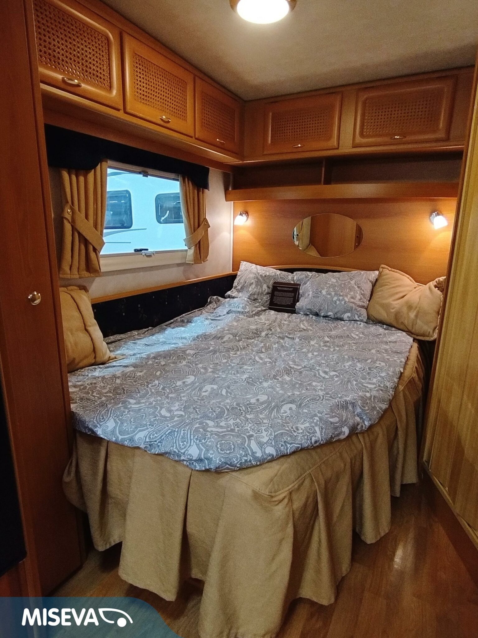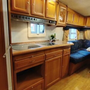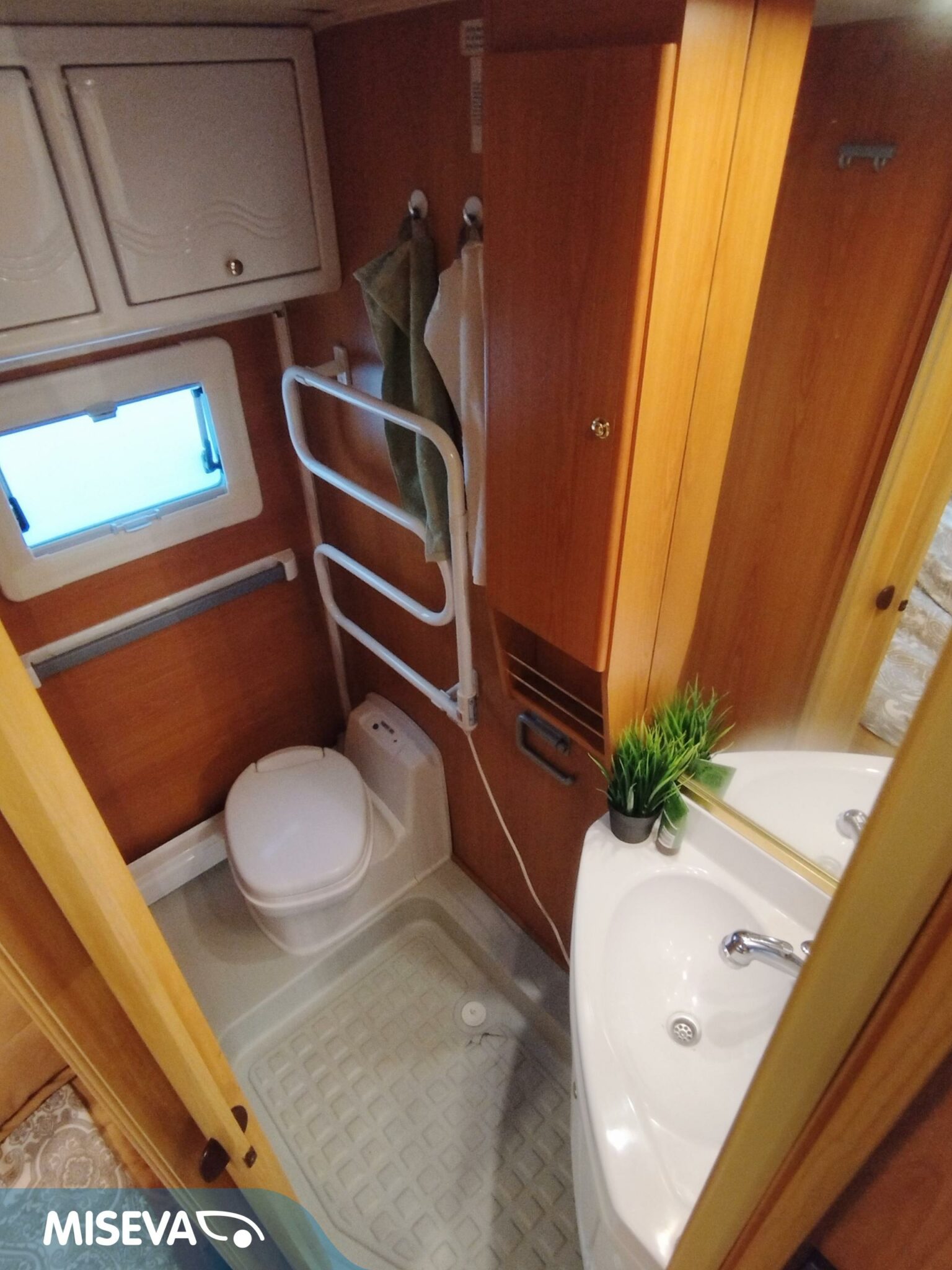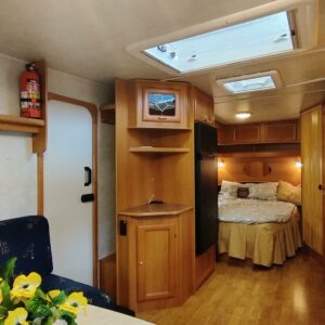 Edessä tilava U-ryhmä mistä saa sijattua vuoteen kahdelle henkilölle. Keskellä avara keittio normaalilla keittiövarustuksella ja isolla jääkaapilla. Takana pitkittäinen parivuode ja WC/kylpyhuonetilat.