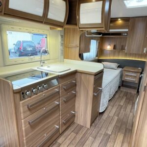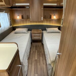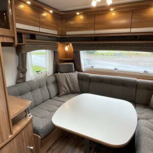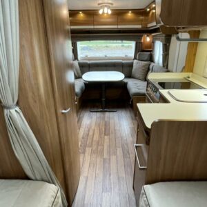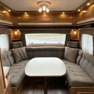 Pohjaratkaisussa edessä muhkea u- sohvaryhmä. Keskiosassa keittiö jossa runsaasti säilytystilaa sekä wc & suihkutila. Takaosassa erillisvuoteet.