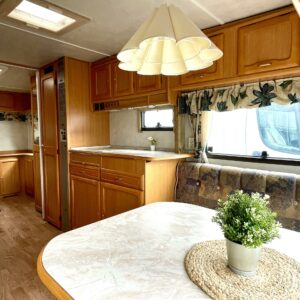 Siistikuntoinen matkavaunu Alde- nestekiertolämmityksellä edullisesti. Matala parivuode takana ja iso istuinryhmä edessä. Istuinryhmä sijattavissa isoksi parivuoteeksi.