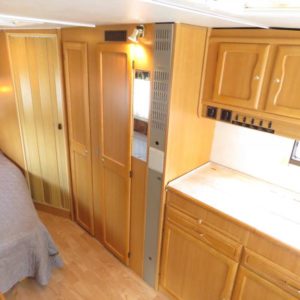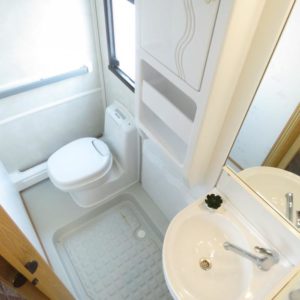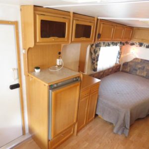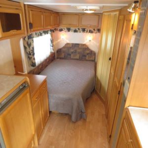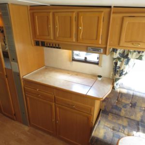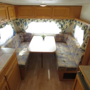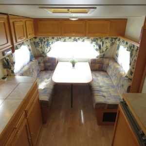 Vaunun takaosassa pitkittäinen parivuode ja pesuhuone, edessä pöytäryhmä neljälle. Pöytäryhmä sijattavissa toiseksi parivuoteeksi.