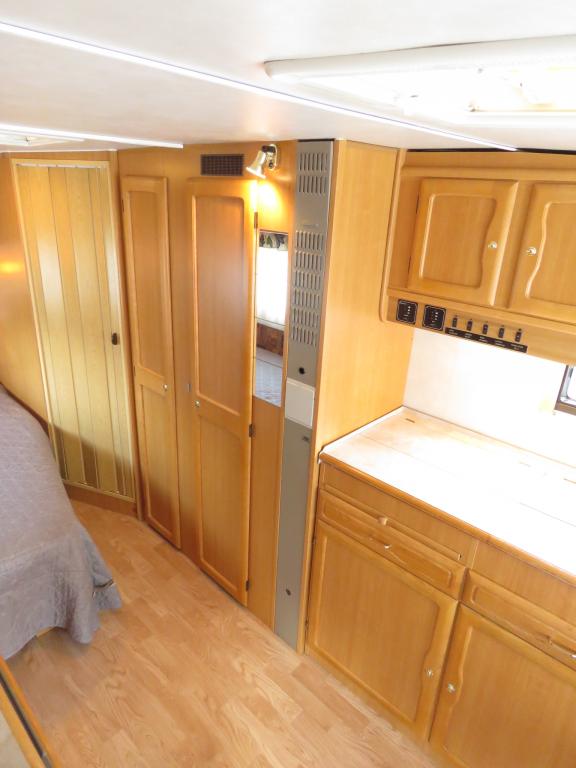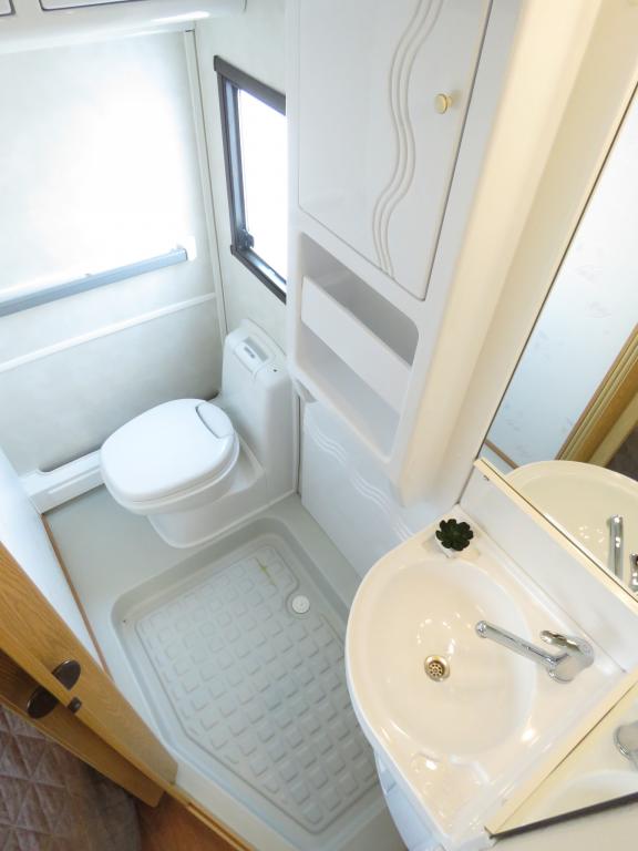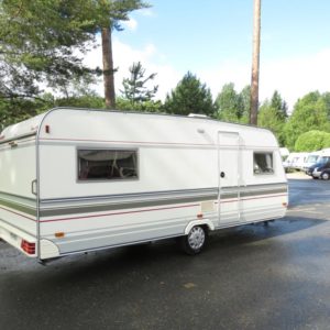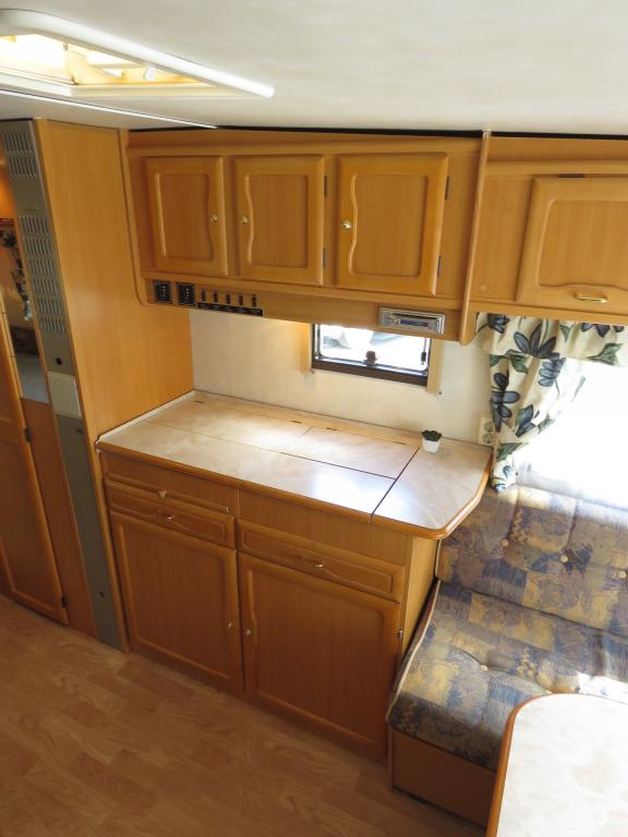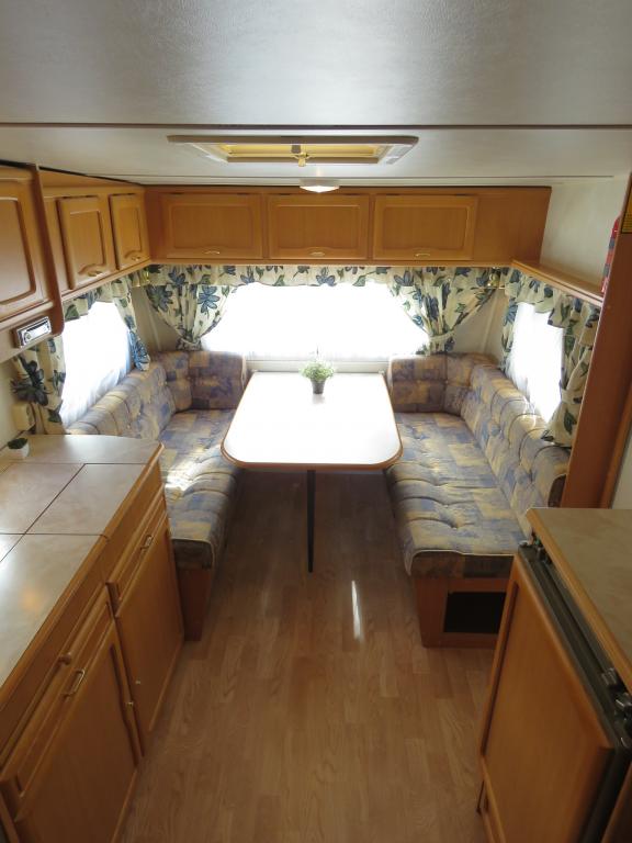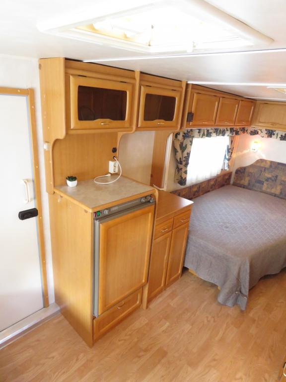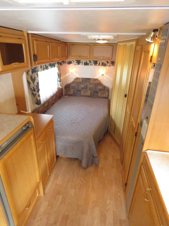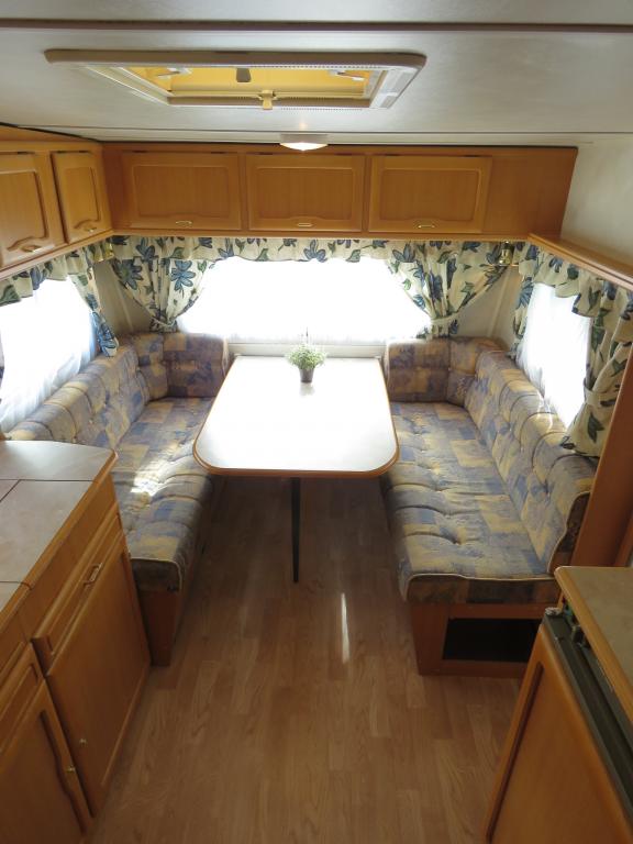 Vaunun takaosassa pitkittäinen parivuode ja pesuhuone, edessä pöytäryhmä neljälle. Pöytäryhmä sijattavissa toiseksi parivuoteeksi.