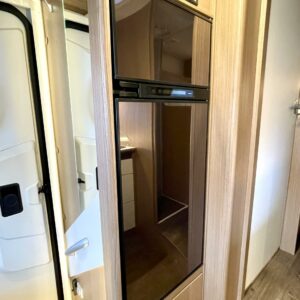 L- keittiöstä löytyy kaikki tarpeellinen, kuten kolmipolttiminen kaasuliesi, tiskiallas, liesituuletin ja astiakaapisto. Kokin/kokittaren selän takana sijaitsee tilava kolmitoimijääkaappi erillisellä pakastinosalla.