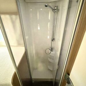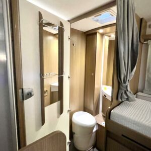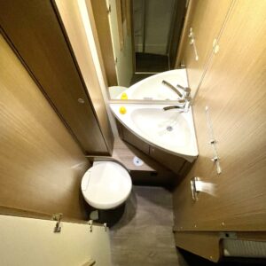 Erittäin tilava wc ja suihkutila sijaitsevat vastakkain käytävän molemmin puolin. Kumpikin tila on varustettu omalla kattoluukullaan mahdollistaen luonnonvalon ja tehokkaan ilmanvaihdon.