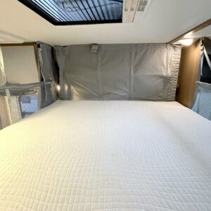 Takaosan erillisvuoteet ovat yhdistettävissä yhdeksi valtavaksi koko auton levyiseksi siskonpediksi. Osastoiva väliovi ja pimentävä väliverho tuovat tarvittaessa yksityisyyttä ja helpottavat vaikka päivänokosten ottamista jos siltä tuntuu.