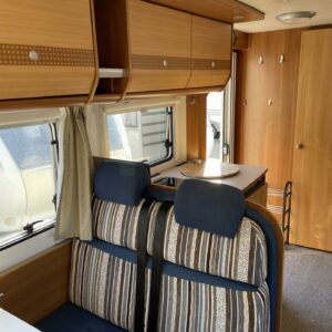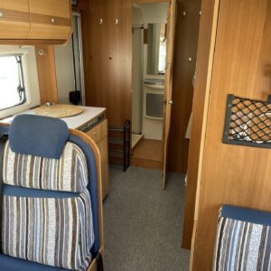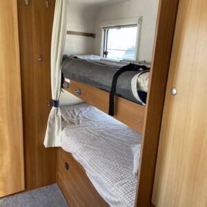 Tilava perheauto kahdella pöytäryhmällä ja kerrosvuoteilla. Tähän autoon mahtuu 6 matkustajaa kyytiin sekä nukkumaan.