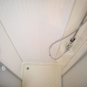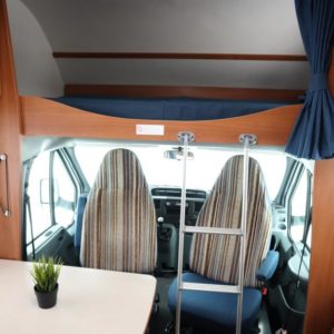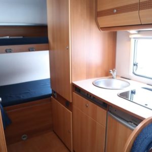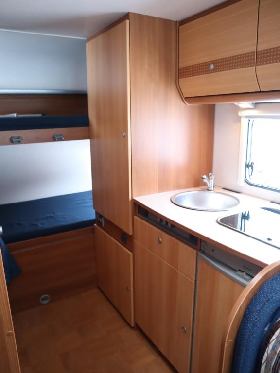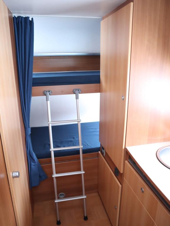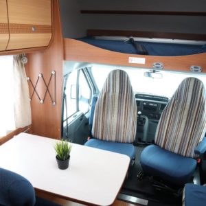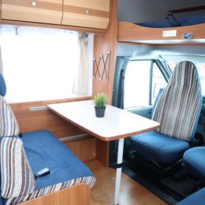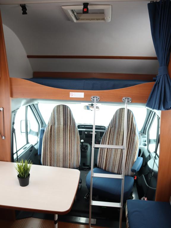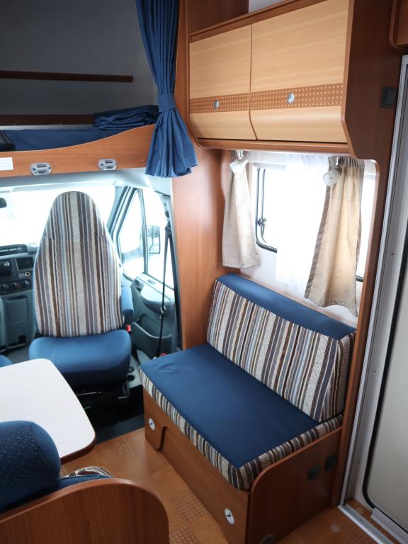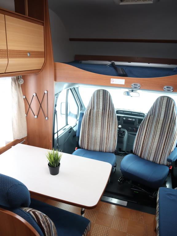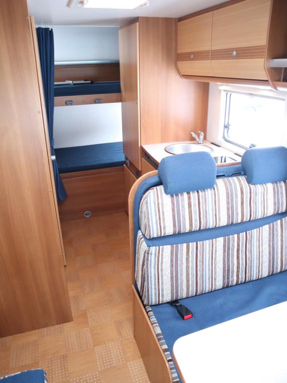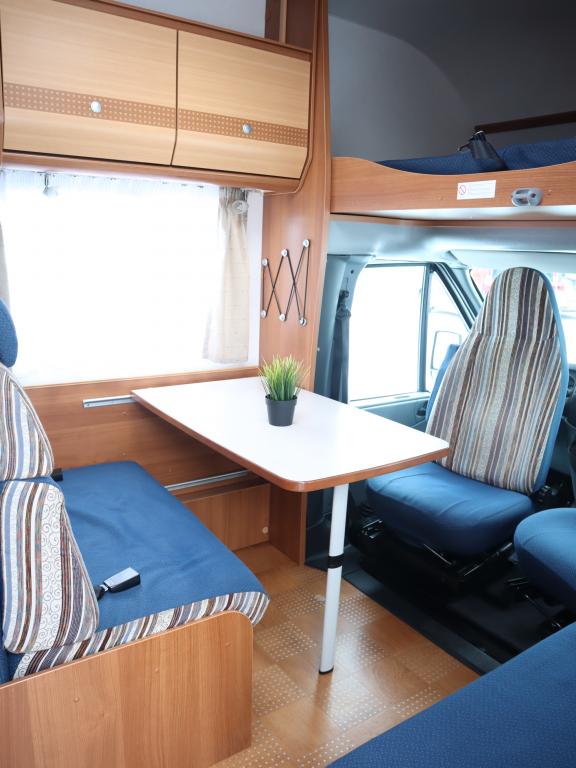 Auton takaosassa kerrosvuoteet, edessä leveä alkovivuode ja valoisa pöytäryhmä sivusohvalla.