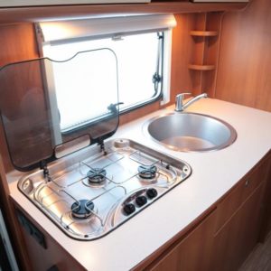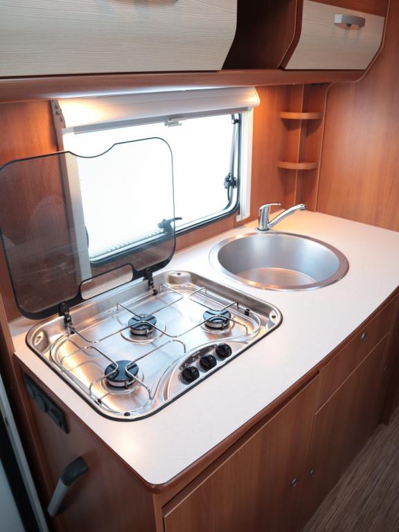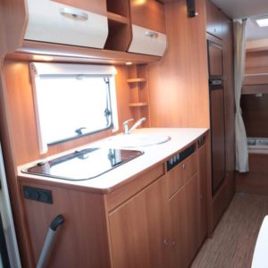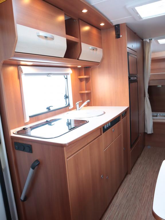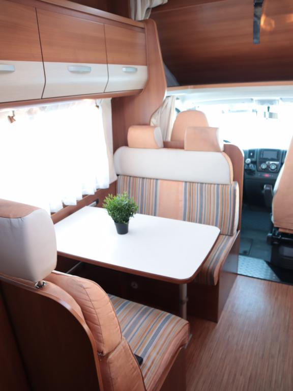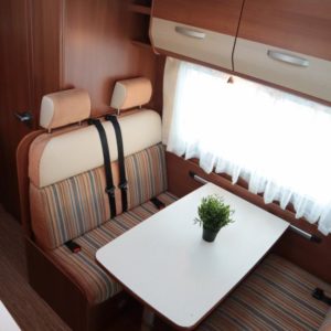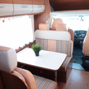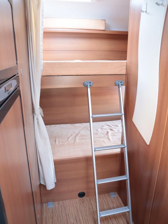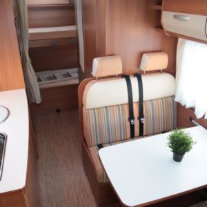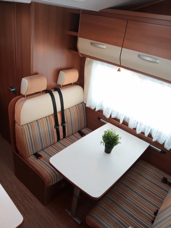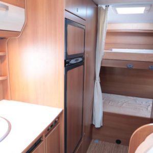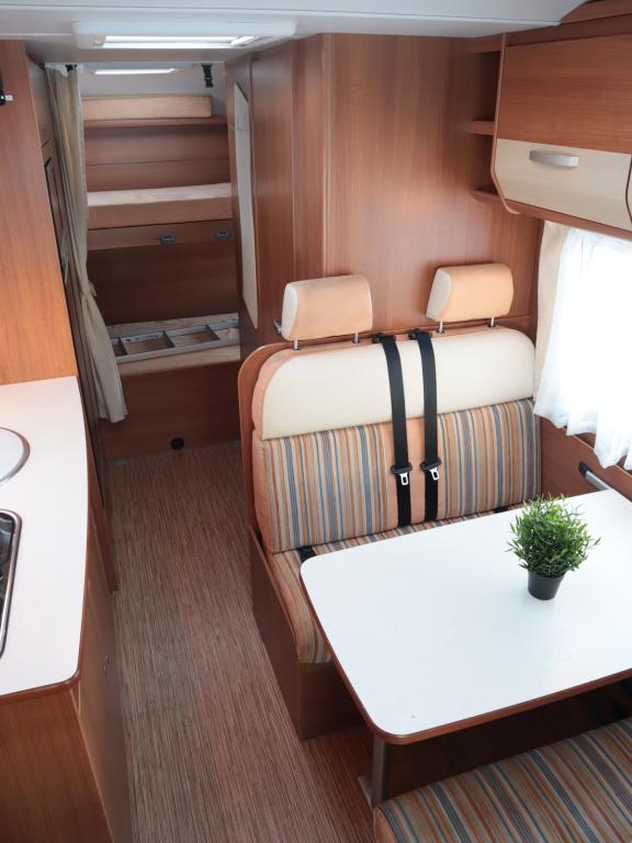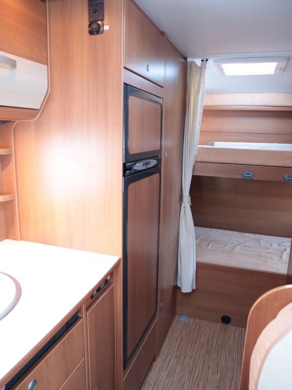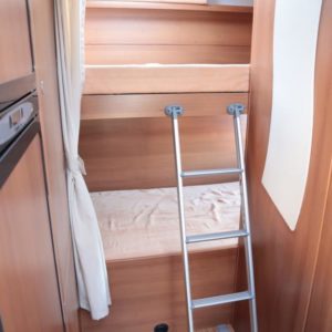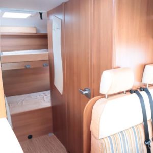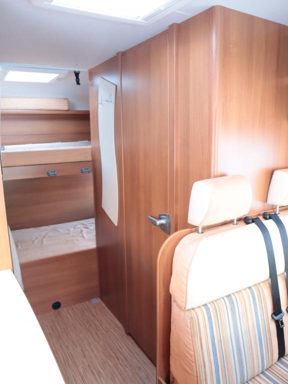 Auton takaosassa koko auton levyiset kerrosvuoteet joista alempi käännettävissä takatallin kasvattamiseksi. Edestä löytyy leveä alkovivuode. Toinen parivuode sijattavissa pöytäryhmästä.
