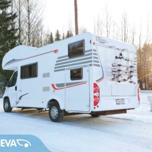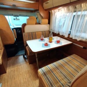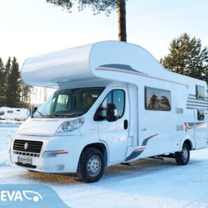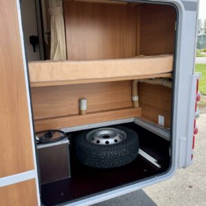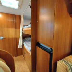 Auton takaosassa kerrosvuoteet ja tilava pesuhuone/ WC- erillisellä suihkunurkkauksella. Auton etuosasta löytyy kaksi pöytäryhmää ja leveä alkovivuode.