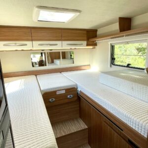 Suosittu erillisvuoteinen Carado. Takana olevat vuoteet voi myös yhdistää tosi isoksi parivuoteeksi. Ja alla hulppen kokoinen tavaratila kaikille harratusvälineille.