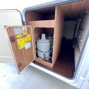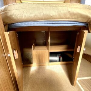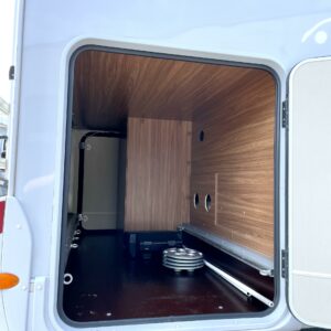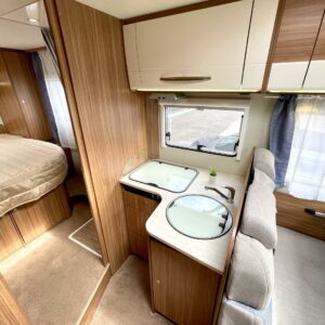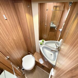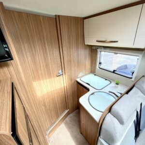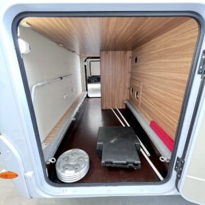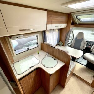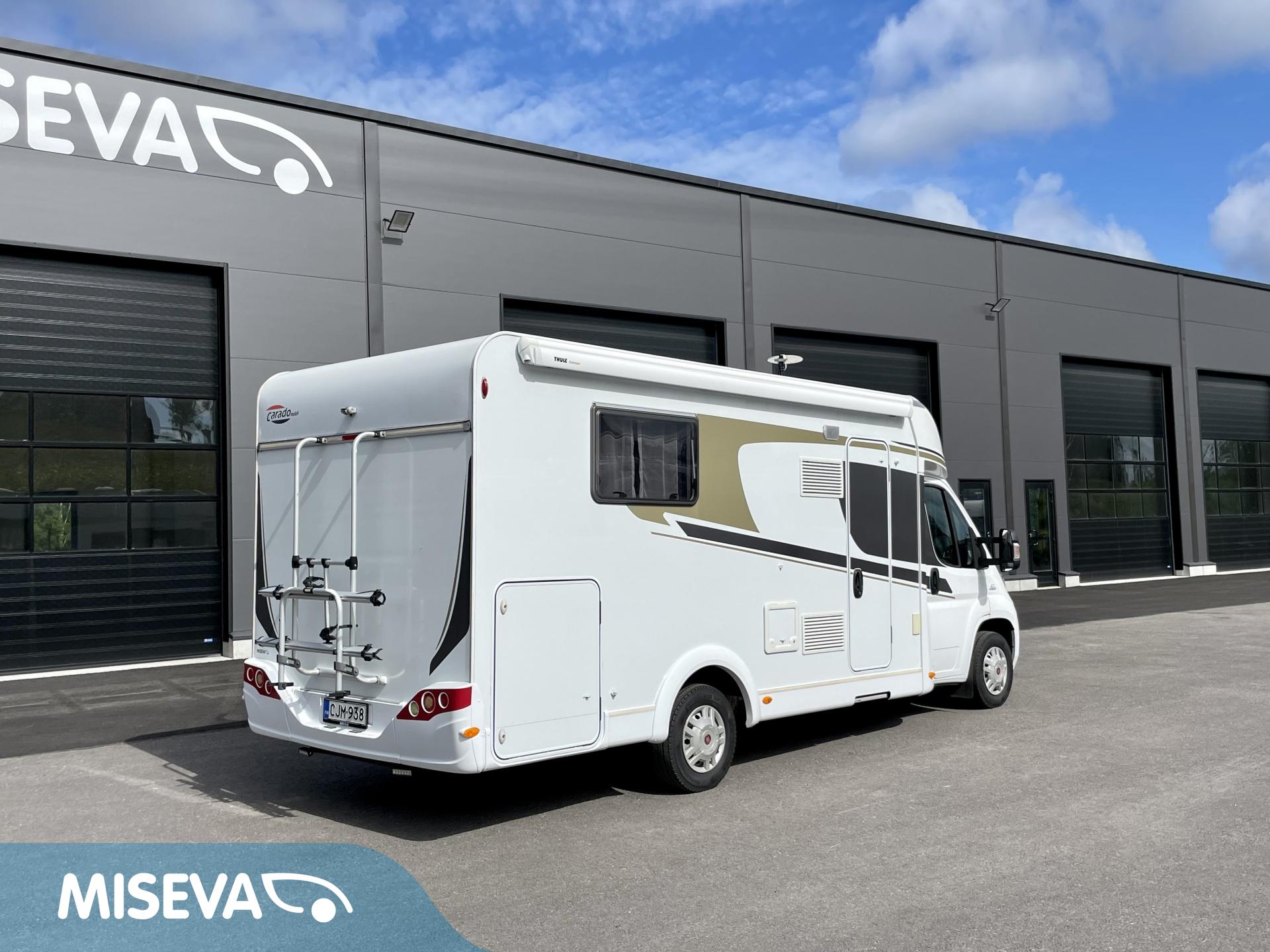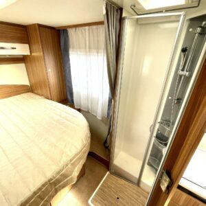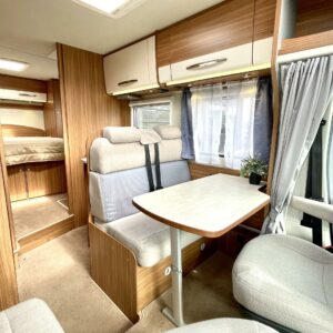 Auton takaosassa leveä saarekevuode, edessä valoisa pöytäryhmä lyhyellä sivusohvalla. Auton keskiosasta löytyy erilliset WC-/ suihkutilat sekä L- keittiö isolla jääkaappi- pakastimella varustettuna.