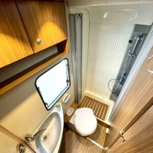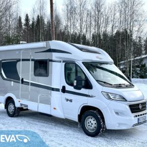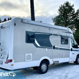 Auton etuosassa on viihtyisä pöytäryhmä sivusohvalla. Peräpäästä löytyy pitkittäinen parivuode ja pesuhuone/ WC.