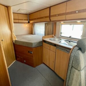 Erittäin avava pohjaratkaisu; Auton takaosassa pitkittäinen parivuode ja pesuhuone/WC erillisellä suihkunurkkauksella, edessä valoisa pöytäryhmä leveällä sivusohvalla.