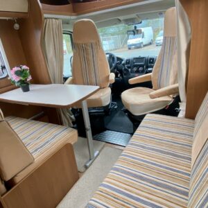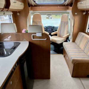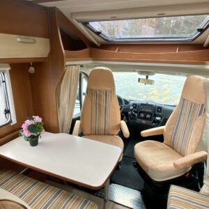 Etuosassa on viihtyisä pöytäryhmä kääntyvillä ohjaamon penkeillä, jolloin pöydän ympärille mahtuu isompikin seurue illallistamaan tai vain seurustelemaan. Keskeltä löytyy keittiö perusominaisuuksilla ja kosolti säilytystilaa korkeiden kaappien muodossa.