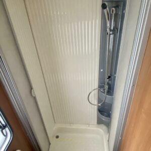 Takaosassa on pitkittäinen parivuode ja hyvät wc- ja pesutilat, joissa suihkulle on ihan oma nurkkaus.