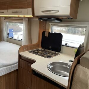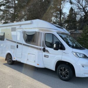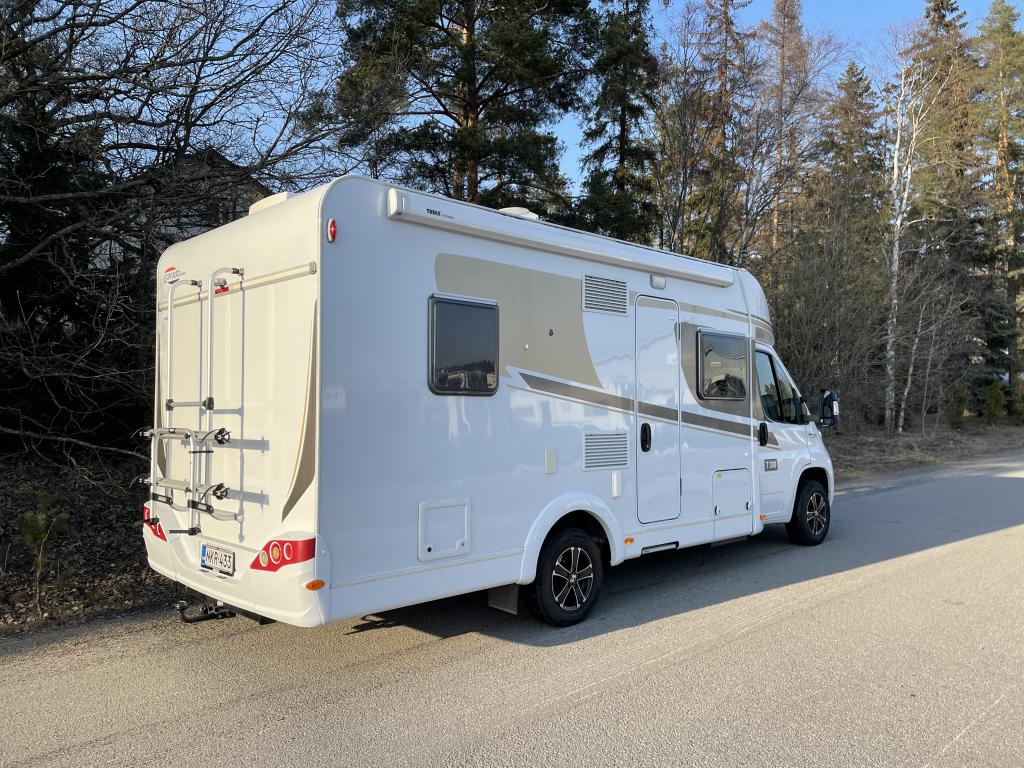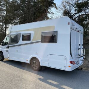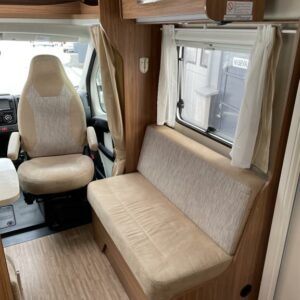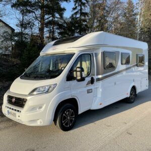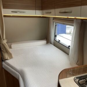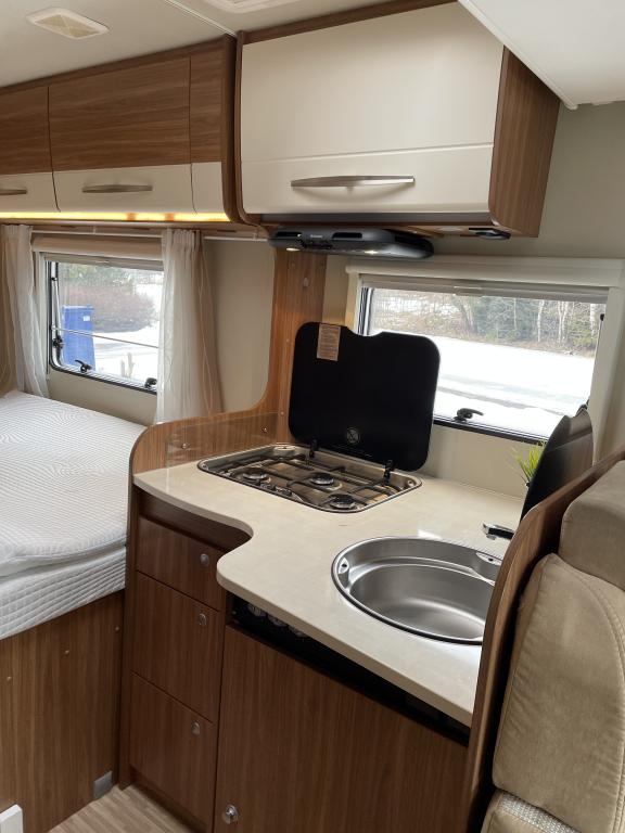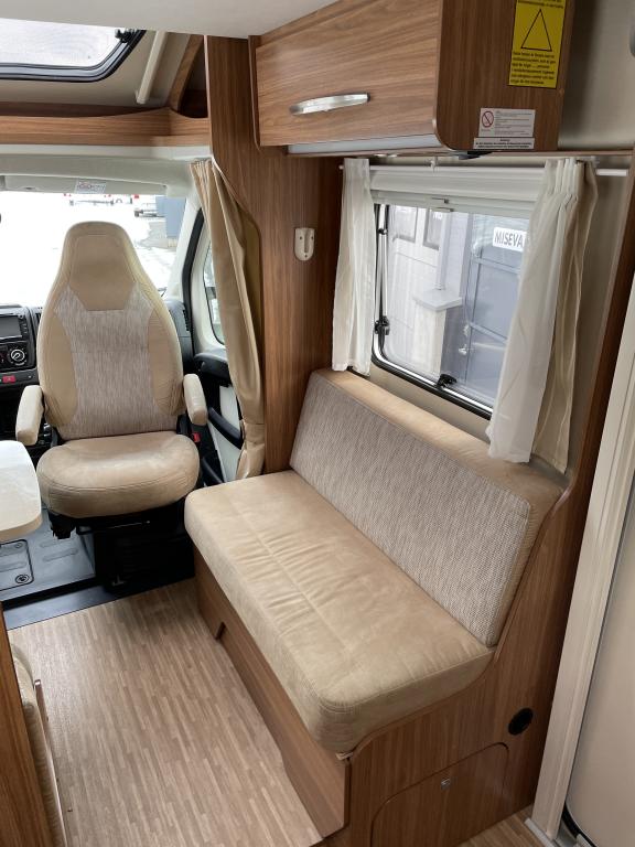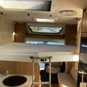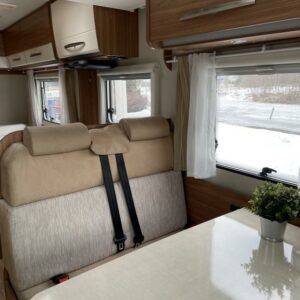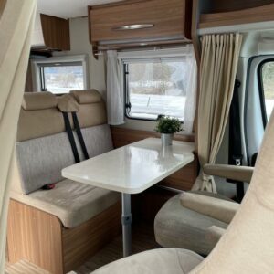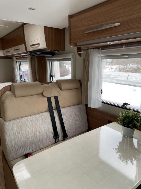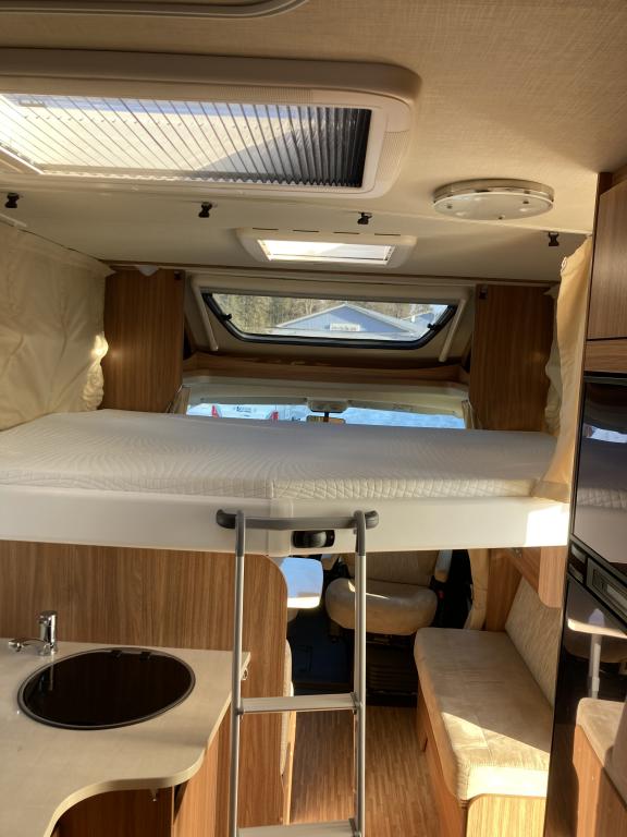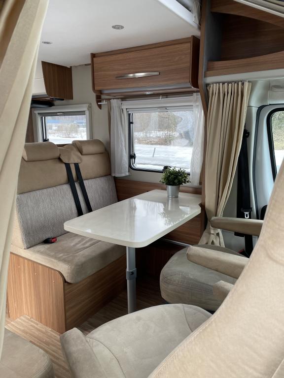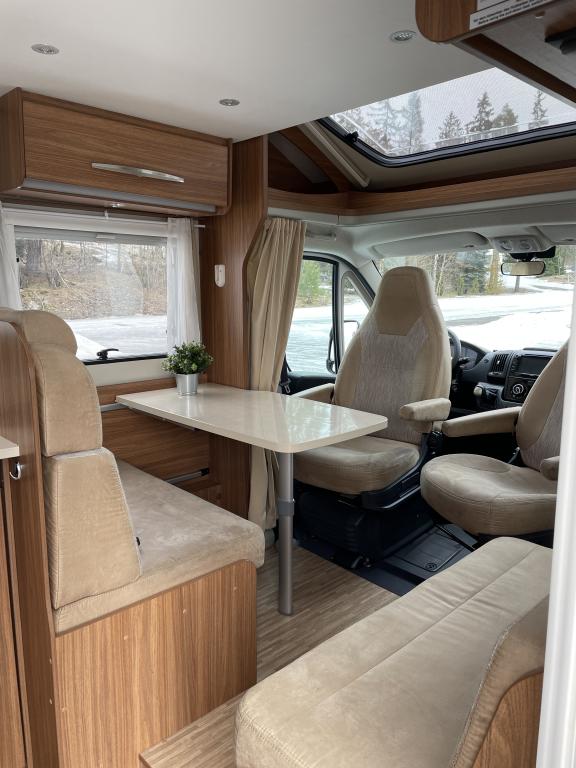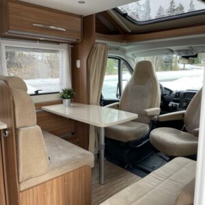 Pitkittäinen parivuode takana, vieressä tilava wc-tila suihkulla. Keskellä keittiö suurella jääkaapilla. Edessä pöytäryhmä jopa kuudelle kääntyvin ohjaamopenkein. Pöytäryhmän päällä alaslaskettava parivuode. Varusteissa mm tv,kaasunulosotto…