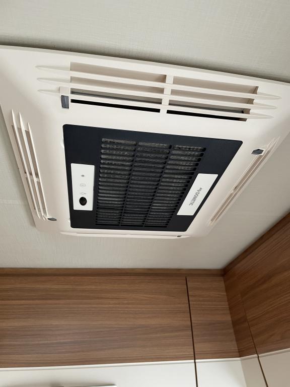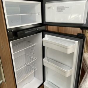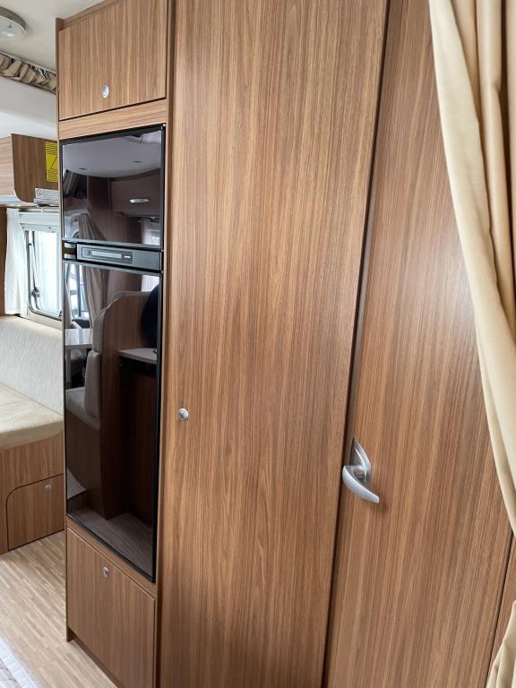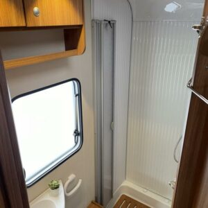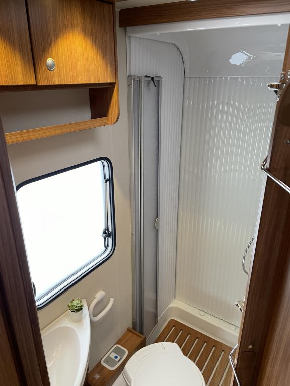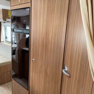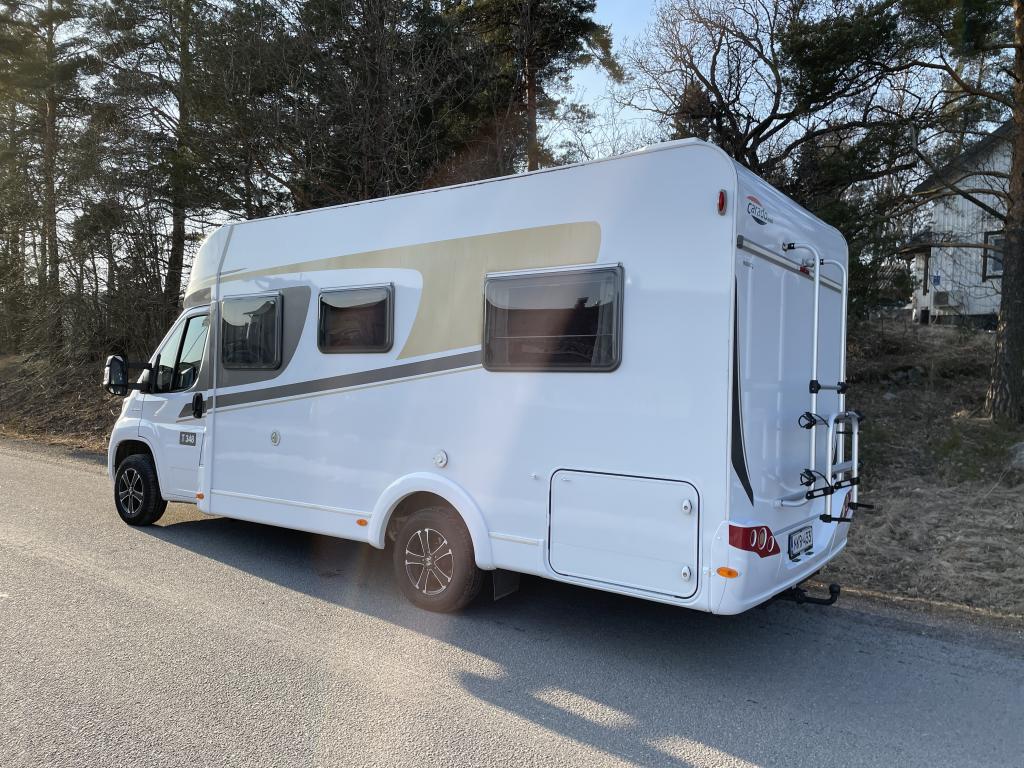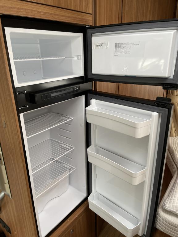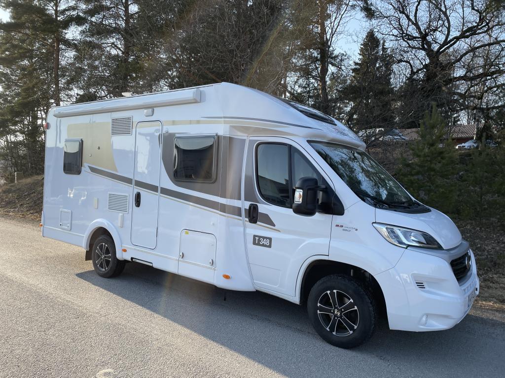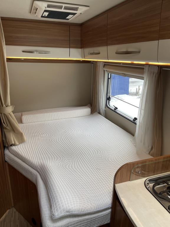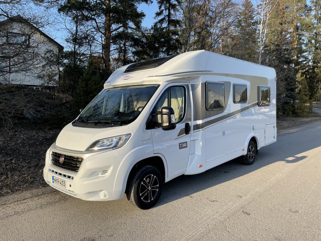 Pitkittäinen parivuode takana, vieressä tilava wc-tila suihkulla. Keskellä keittiö suurella jääkaapilla. Edessä pöytäryhmä jopa kuudelle kääntyvin ohjaamopenkein. Pöytäryhmän päällä alaslaskettava parivuode. Varusteissa mm tv,kaasunulosotto…