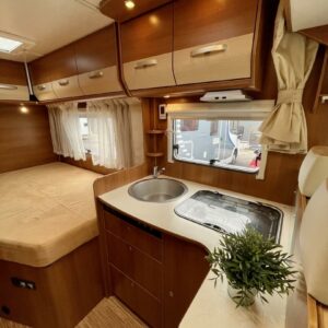 Pohjaratkaisuna edessä avara pöytäryhmä kääntyvin ohjaamon penkein sekä sivusohva. Takana parivuode ja WC- sekä suihkutila. Keskellä keittiö, sekä pöytäryhmän päälle laskettava vuode..