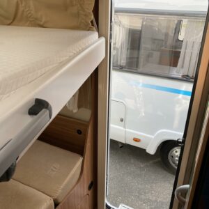 Takana pitkittäinen matala parivuode sekä WC/kylpyhuonetilat. Keskellä L-keittiö ja säilytystiloja. Edessä pöytäryhmä minne saadaan yhdistettyä etuistuimet sekä sivusohva. Pöytäryhmän yläpuolella alaslaskettava vuode.
