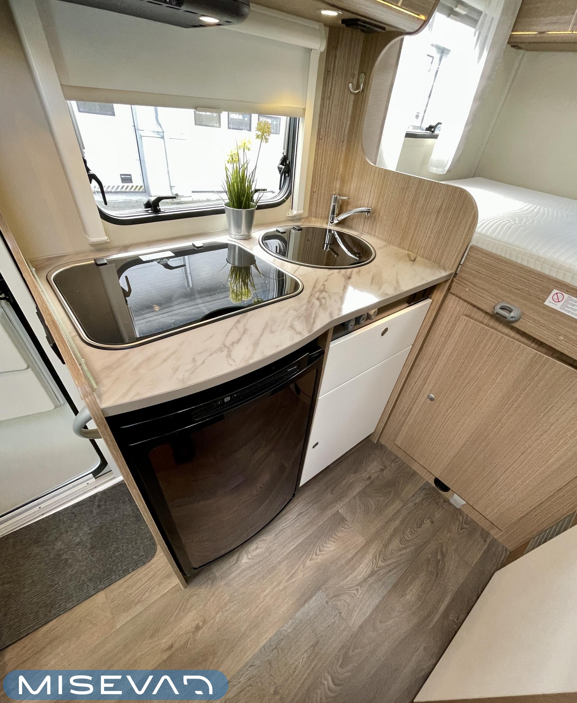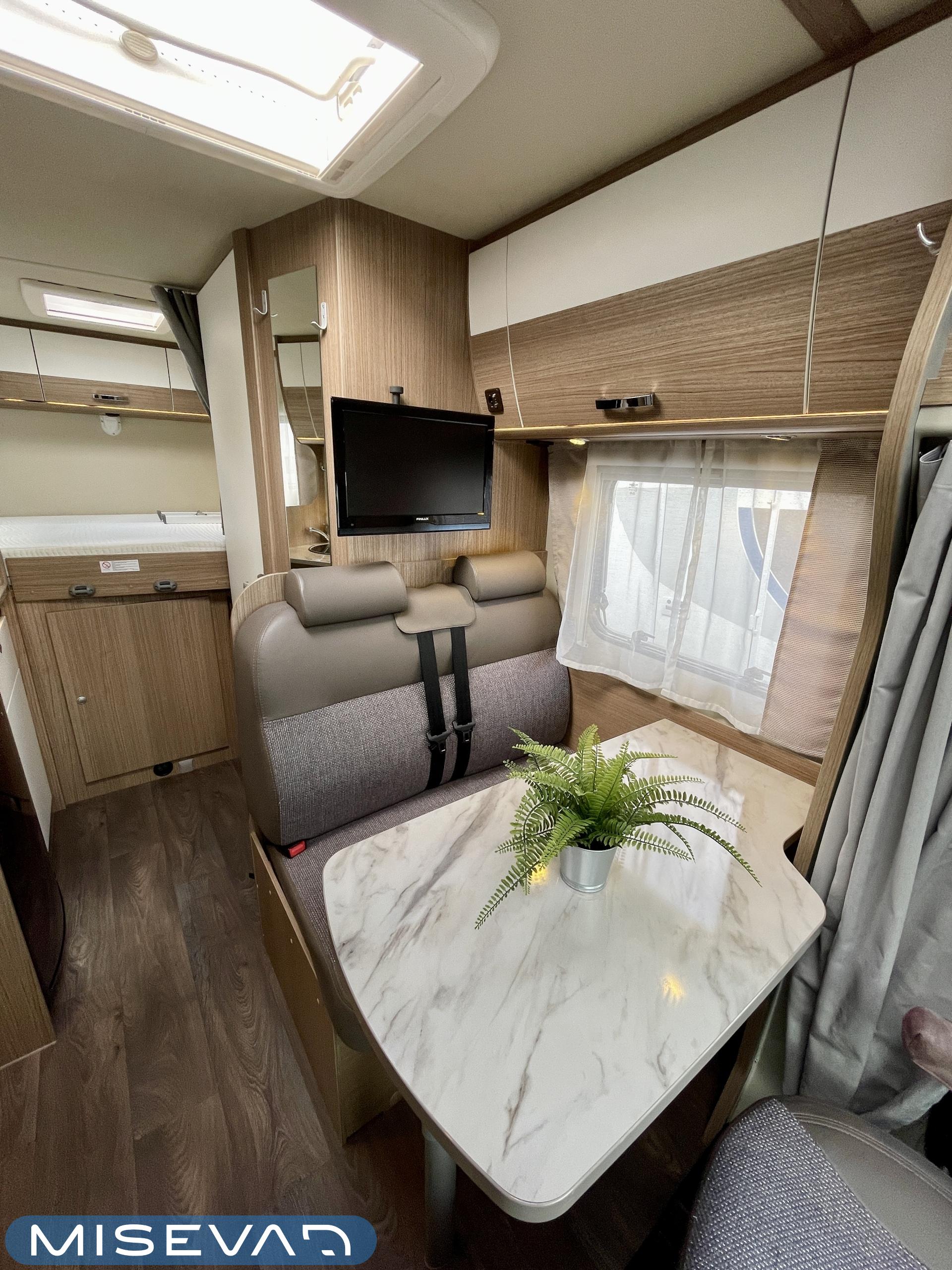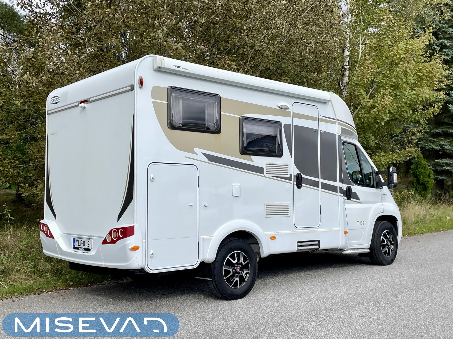 Tässä Caradossa on kaikki tarpeellinen: toimivat perusvarusteet, joilla pärjää mainiosti matkassa. Tavaratila eli takatalli on tilava, sillä parivuode on sijoitettu poikittain ja korkealle. Sinne mahtuvat helposti harrastusvälineet, retkikalusto tai vaikka puutarhakalusteet, joilla on mukava istua iltaa markiisin suojassa.