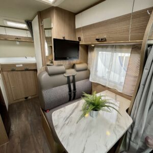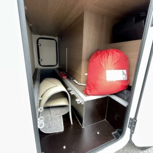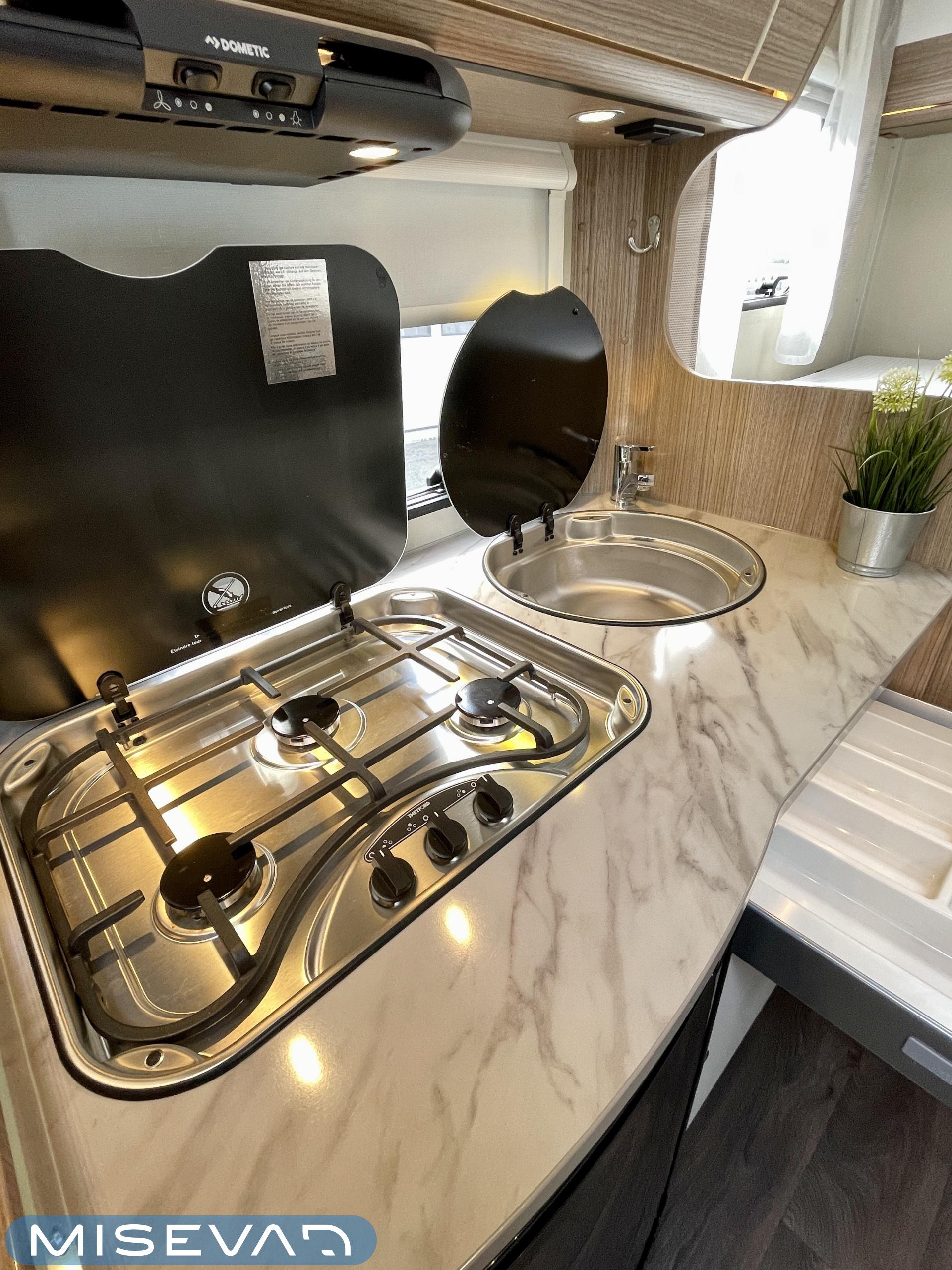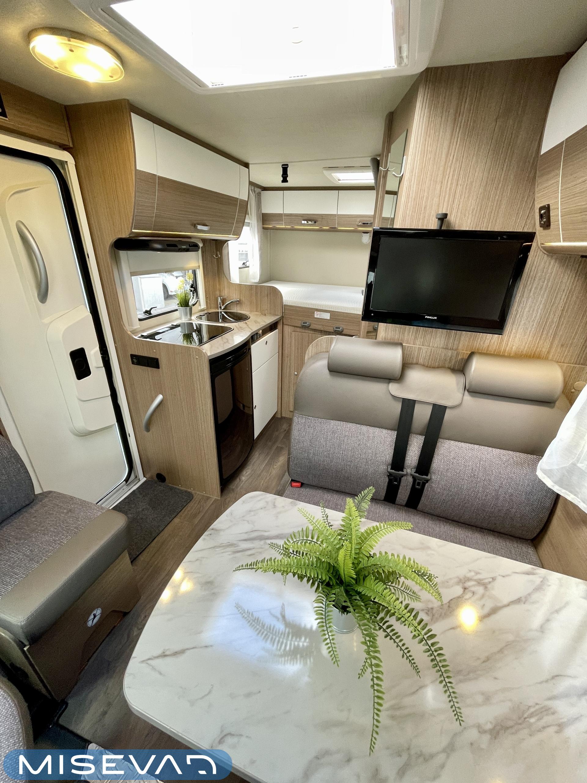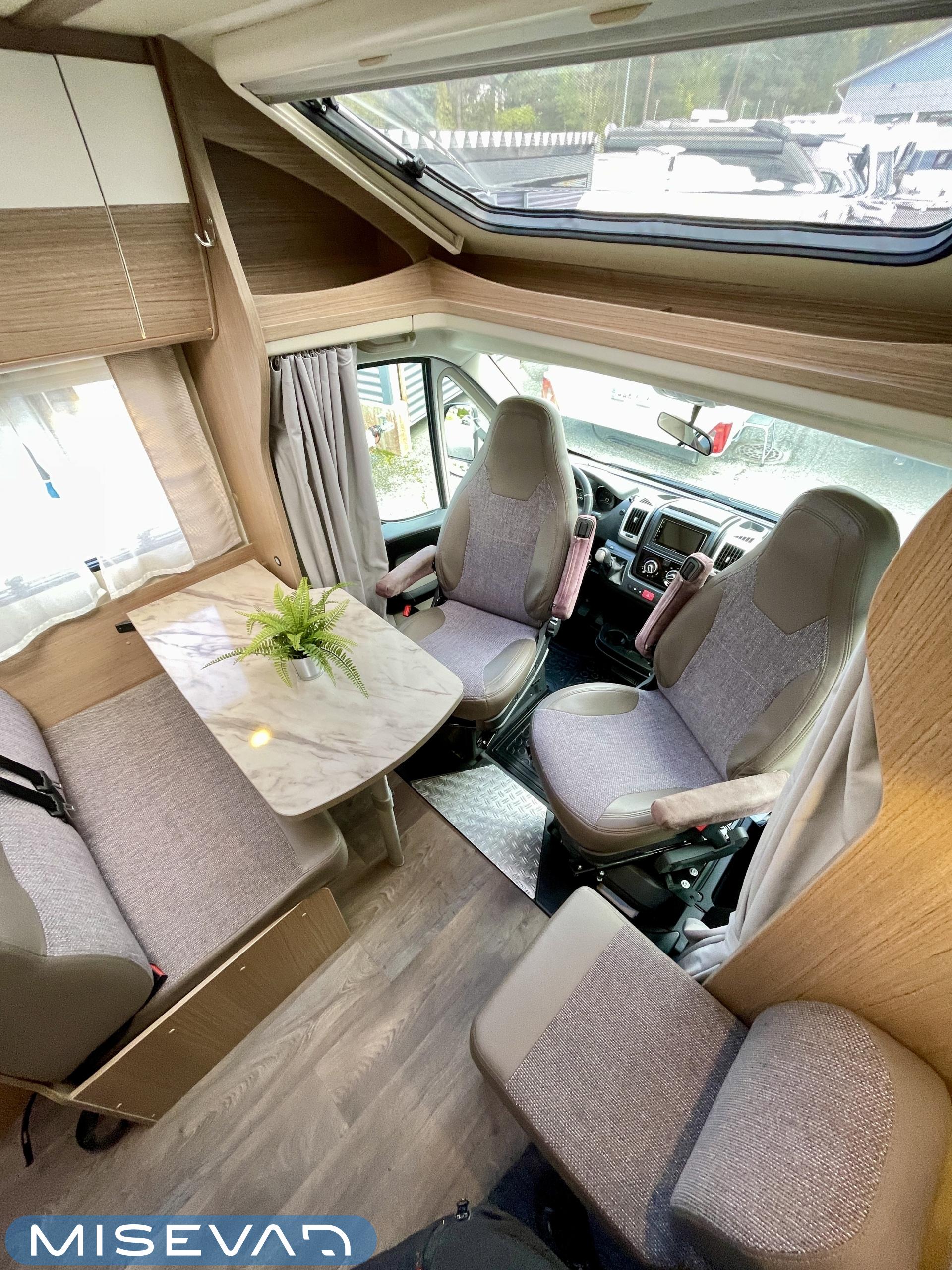 Tässä Caradossa on kaikki tarpeellinen: toimivat perusvarusteet, joilla pärjää mainiosti matkassa. Tavaratila eli takatalli on tilava, sillä parivuode on sijoitettu poikittain ja korkealle. Sinne mahtuvat helposti harrastusvälineet, retkikalusto tai vaikka puutarhakalusteet, joilla on mukava istua iltaa markiisin suojassa.