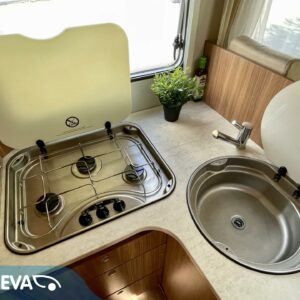7 m kokonaispituus tarjoaa toimivat tilat mukavaan caravan- elämään. Auton etuosasta löytyy vaalealla kankaalla verhoiltu istuinryhmä lyhyellä sivusohvalla. Pöytäryhmästä syntyy tarvittaessa varavuode yhdelle ylimääräiselle nukkujalle.