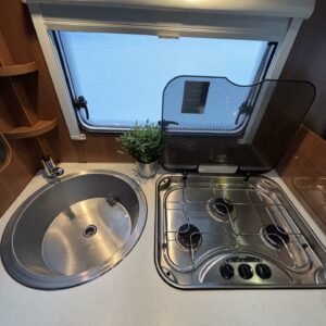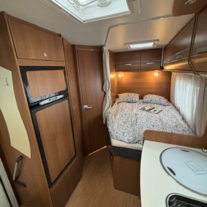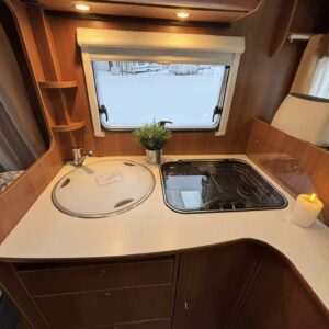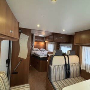 2 + 2 vuoteilla oleva matka-auto valmiina seuraavalle karavaaniharrastajalle. Autoon sisälle tultaessa saavumme ”olohuoneeseen” missä on pöytäryhmä, kahden hengen sivusohva ja kääntyvät kipparinpenkit. Tähän saa varsin mukavan ruokailu/seurusteluryhmän jopa kuudelle hengelle. Pöytäryhmän yläpuolella on laskuvuode missä yöpyy kaksi henkilöä. Huomattavaa on, että vaikka vuode on ala-asennossa, niin käyntiovesta mahtuu kulkemaan suorin vartaloin (useasti joutuu kumartuen menemään vuoteen alta). Pöytäryhmästä saadaan lisäksi vielä tarvittaessa värkättyä tilapäisvuode lapselle. Taakse päin siirryttäessä saavumme keittiöön mistä löytyy mm. iso jääkaappi erillisellä pakastinlokerolla. Auton takaosaan on sijoitettu pitkittäinen parivuode, sekä kylppäritilat missä on erillinen suihkutila. Asunto-osan lämmitysjärjestelmänä on tehokas (6kw) Trumaticin ilmakeskuslämmitys minne on integroitu myös lämminvesiboileri. Ohjaamossa kuljettajaa hellitään vakionopeuden säätimellä, ilmastoinnilla, sähkösäätöisillä peileillä ja ikkunoilla, sekä Pioneerin multimediasoittimellä mikä toimittaa myös navin ja peruutuskameran virkaan. Ajohommat hoituvat ihan tavallisella B-luokan henkilöautokortilla ja rekisteröidyt matkustuspaikat on neljälle henkilölle.