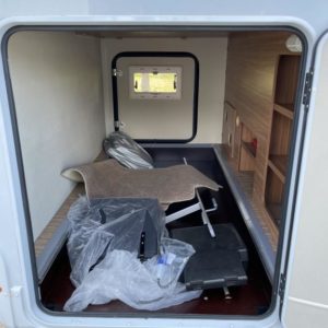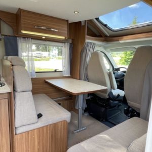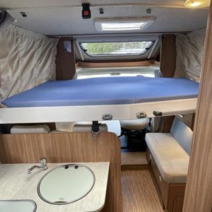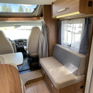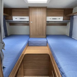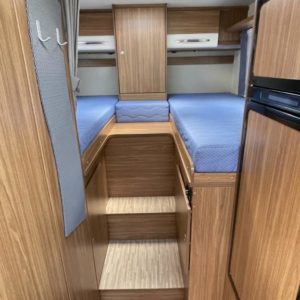 Valoisa pohjaratkaisu, jossa edessä sohvaryhmä ja reilu laskuvuode, keskiosassa keittiö jossa jääkaappipakastin-yhdistelmällä sekä WC & Suihkutila, takaosassa erillisvuoteet. Takana suuri takatalli.