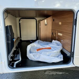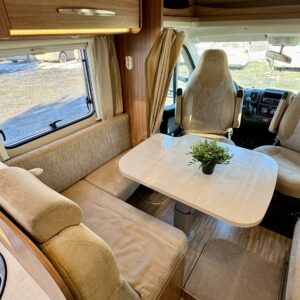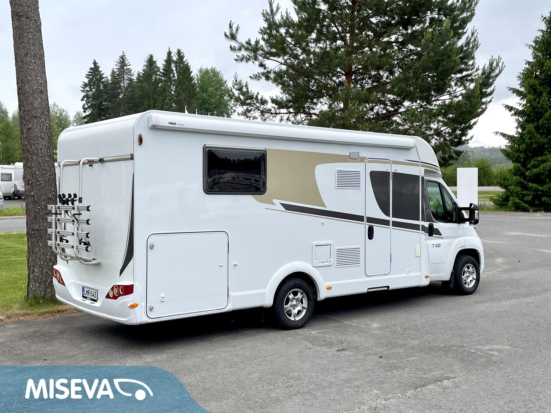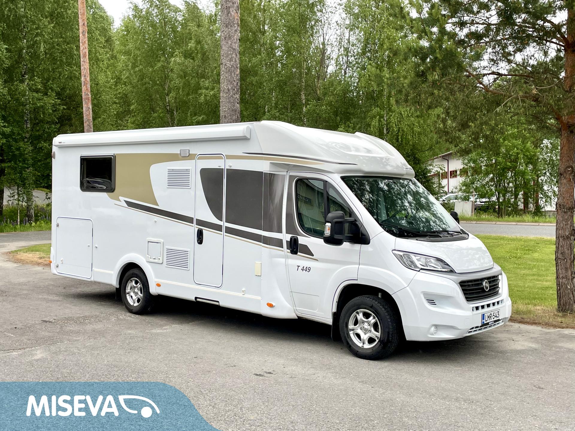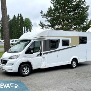 Haluttu saarekevuodemallin puoli-integroitu Carado laskuvuoteella. Eli neljälle matkustajalle kätevästi valmiit makuupaikat ilman stressavaa ”pöytäjumppaa”. Auton takaosaan on sijoitettu pitkittäissuuntaisesti saarekevuode ja sen alapuolelle jää runsaasti säilytystilaa takatallin muodossa. Talli on toimintojen kannalta ihanteellisesti läpilastattavaa mallia, eli ovet molemmilla sivuilla. Makuuhuoneen yhteydessä on WC/kylpyhuonetilat ja vasemmalta puolelta löytyy erillinen suihkutila. Keskiosaa hallitsee keittiö missä on iso jääkaappi erillisellä pakastinlokerolla. Auton etuosassa on pöytäryhmä minne yhdistyvät kääntyvät ohjaamon penkit, sekä sivusohva. Tähän mahtuu mukavasti isompikin ryhmä iltaa istumaan. Pöytäryhmän yläpuolella on alas laskettava vuode mistä saa kädenkäänteessä vuodepaikat kahdelle henkilölle. Ohjaamosta löytyy ilmastointi, sekä vakionopeuden säädin. Jos on tarve ottaa mukaan polkupyörät, niin ne matkustaa vaivattomasti omalla paikallaan takaseinälle sijoitetussa pyörätelineessä. Auton lämmitysjärjestelmänä on Trumaticin tehokkain (6kw) ilmakeskuslämmitys ja siinä lisäksi lämminvesiboileri. Kaikin puolin mallikas peli valmiina reissuun.