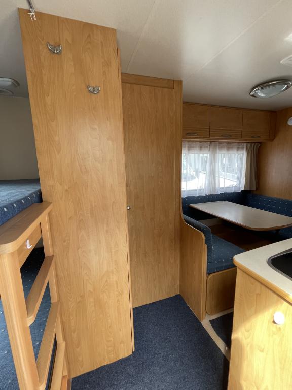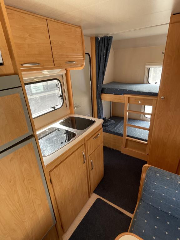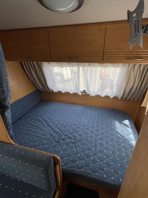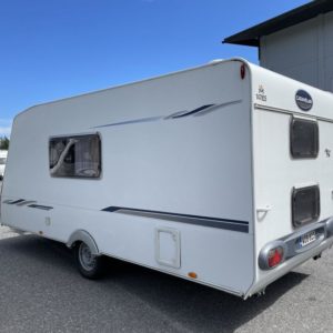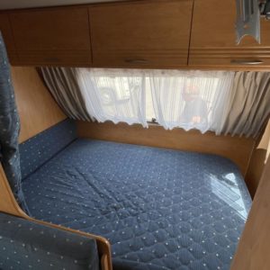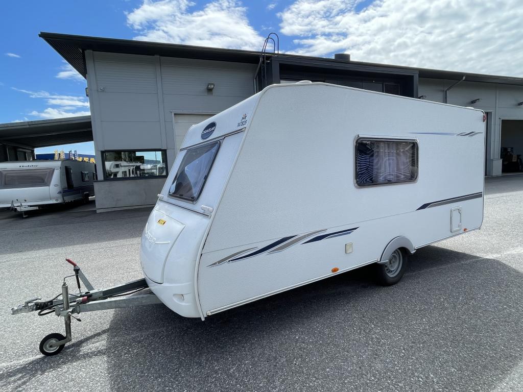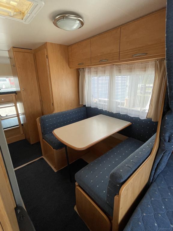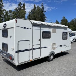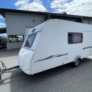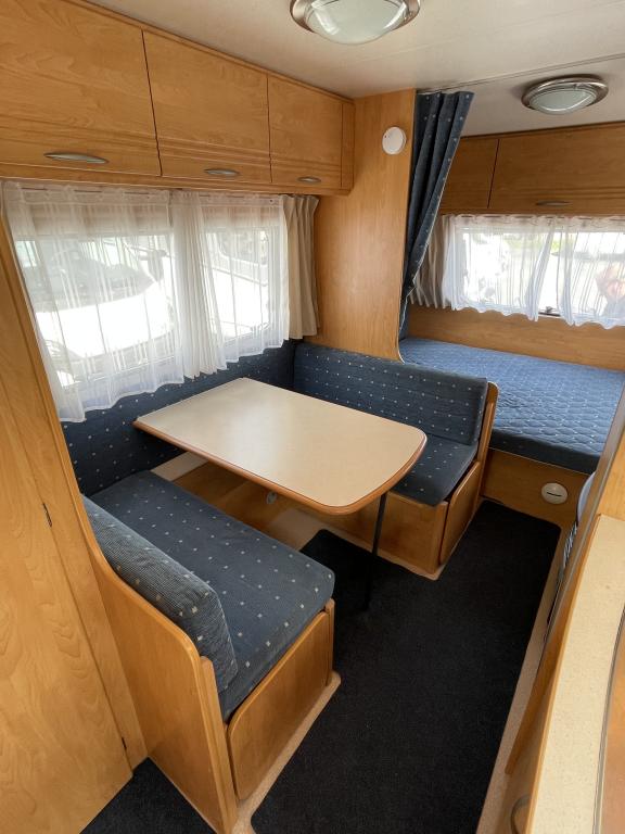 Todella kevyt perhevaunu edullisesti. Omapaino vain 930kg. Takana kerrosvuoteet, keskellä istuinryhmä ja keittiö, edessä parivuode poikittain. Vuoteet jopa kuudelle.