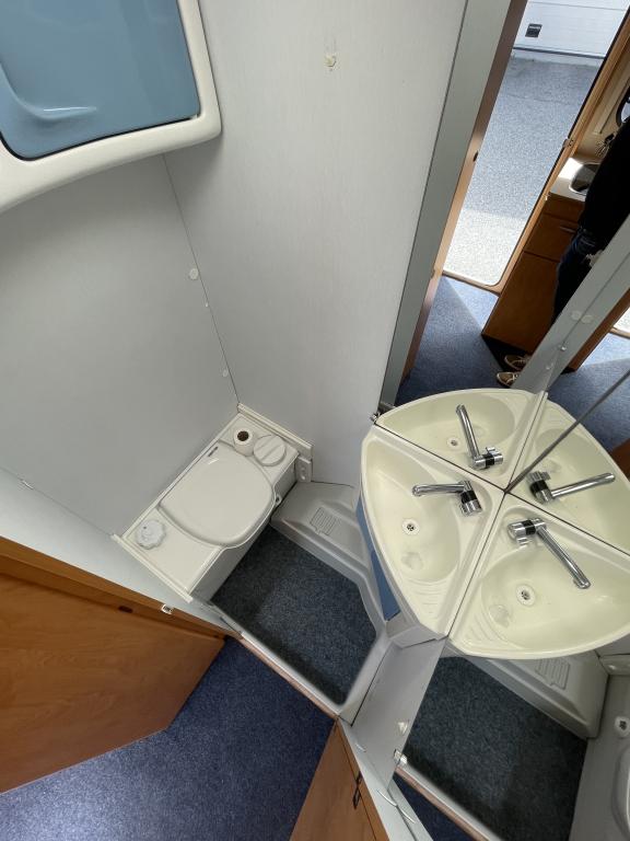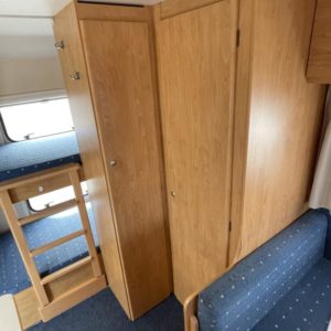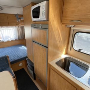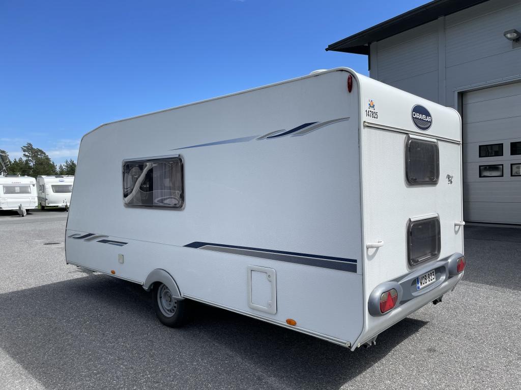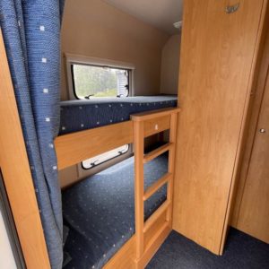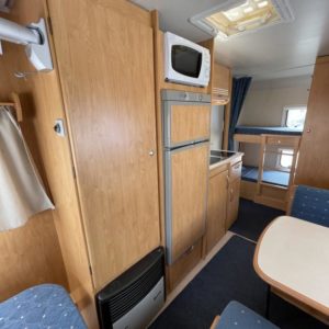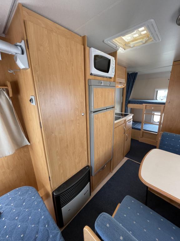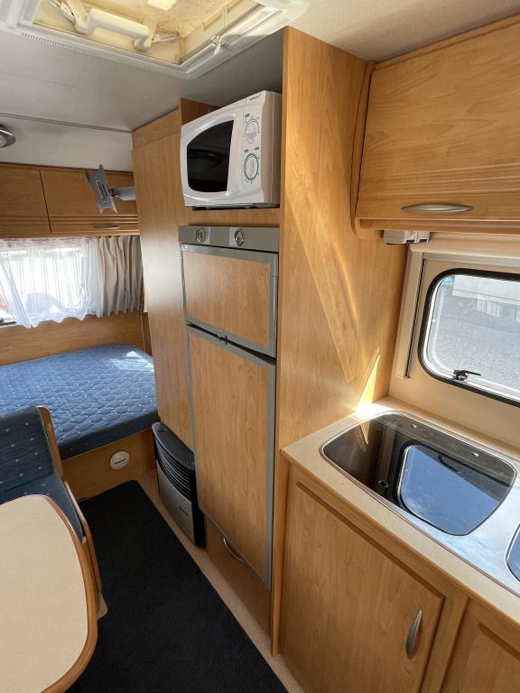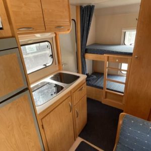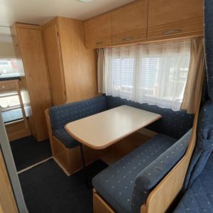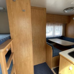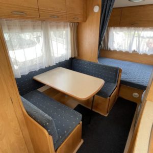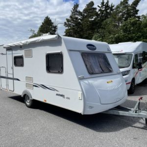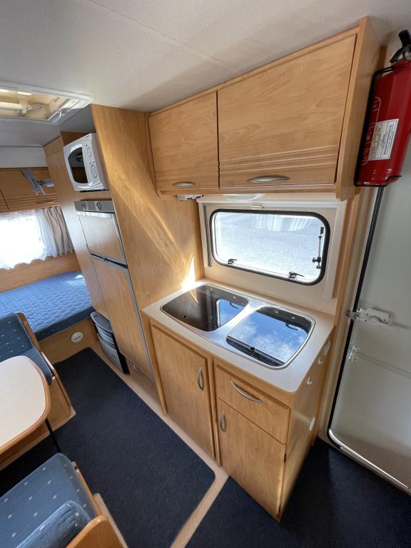 Todella kevyt perhevaunu edullisesti. Omapaino vain 930kg. Takana kerrosvuoteet, keskellä istuinryhmä ja keittiö, edessä parivuode poikittain. Vuoteet jopa kuudelle.