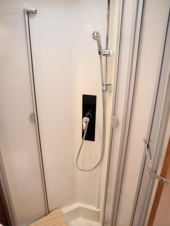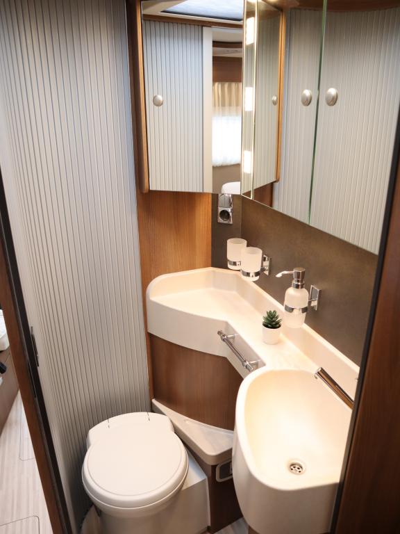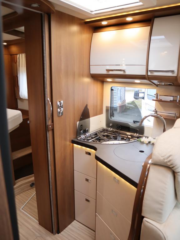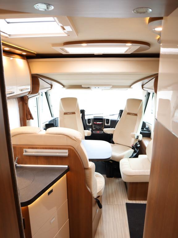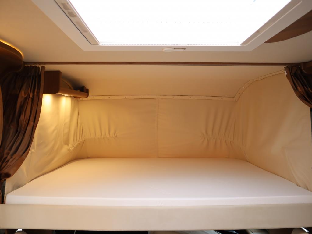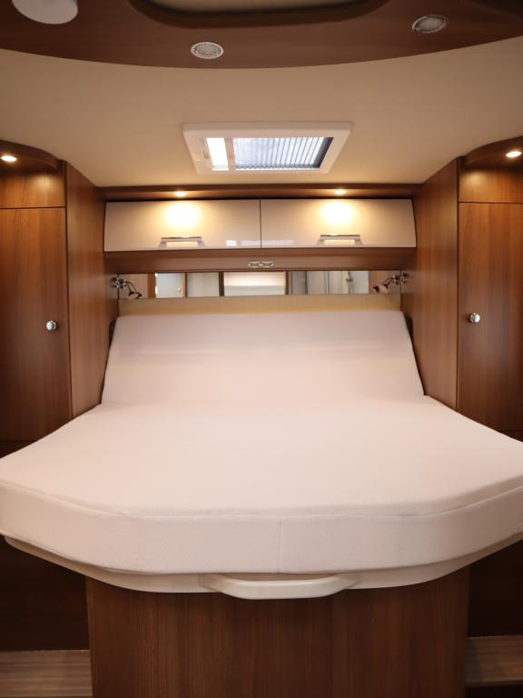 Nyt luxusta tarjolla. Huippukori, kaksoislattia. Takana saarekevuode, ja pesuhuone ja erillinen suihku, keskellä keittiö isolla jääkaapilla, edessä viihtyisä oleskeluryhmä 5:lle ja päällä alaslaskeutuva iso parivuode.