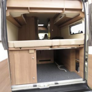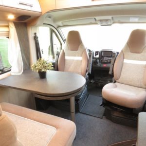 Auton takaosassa pitkittäiset erillisvuoteet, edessä valoisa ja viihtyisä pöytäryhmä neljälle.
