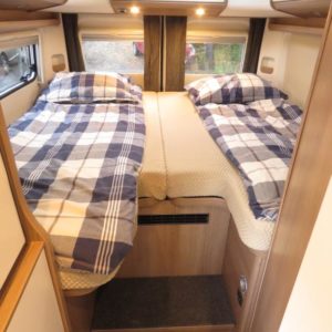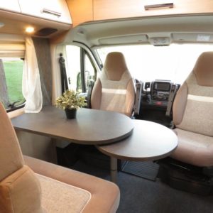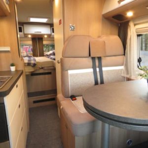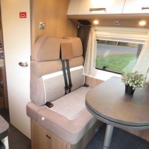 Auton takaosassa pitkittäiset erillisvuoteet, edessä valoisa ja viihtyisä pöytäryhmä neljälle.