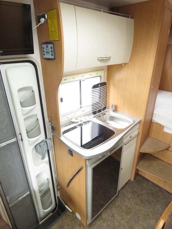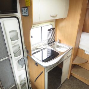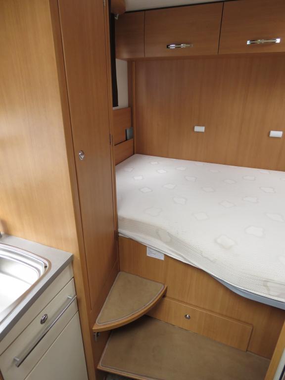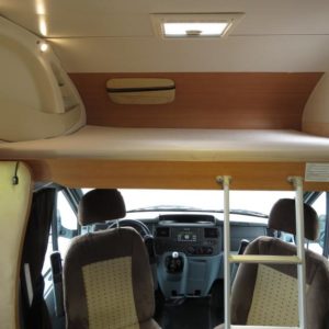 Väkivahvalla koneella. Takana korkeussäädettävä parivuode, keskellä keittiö ja pesuhuone,