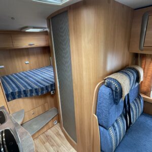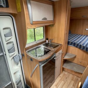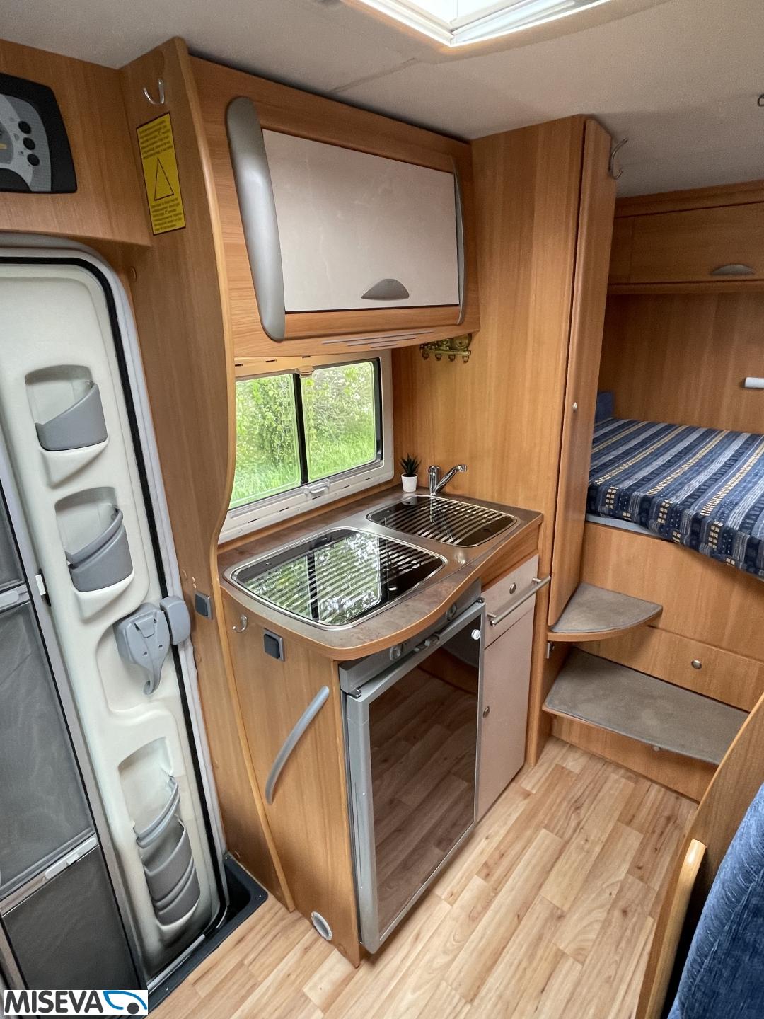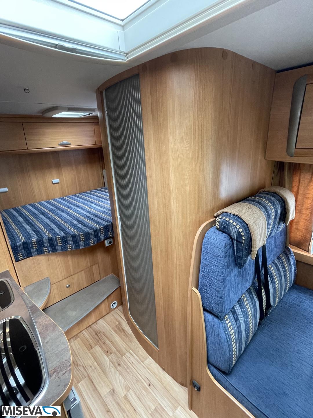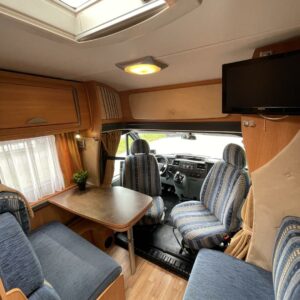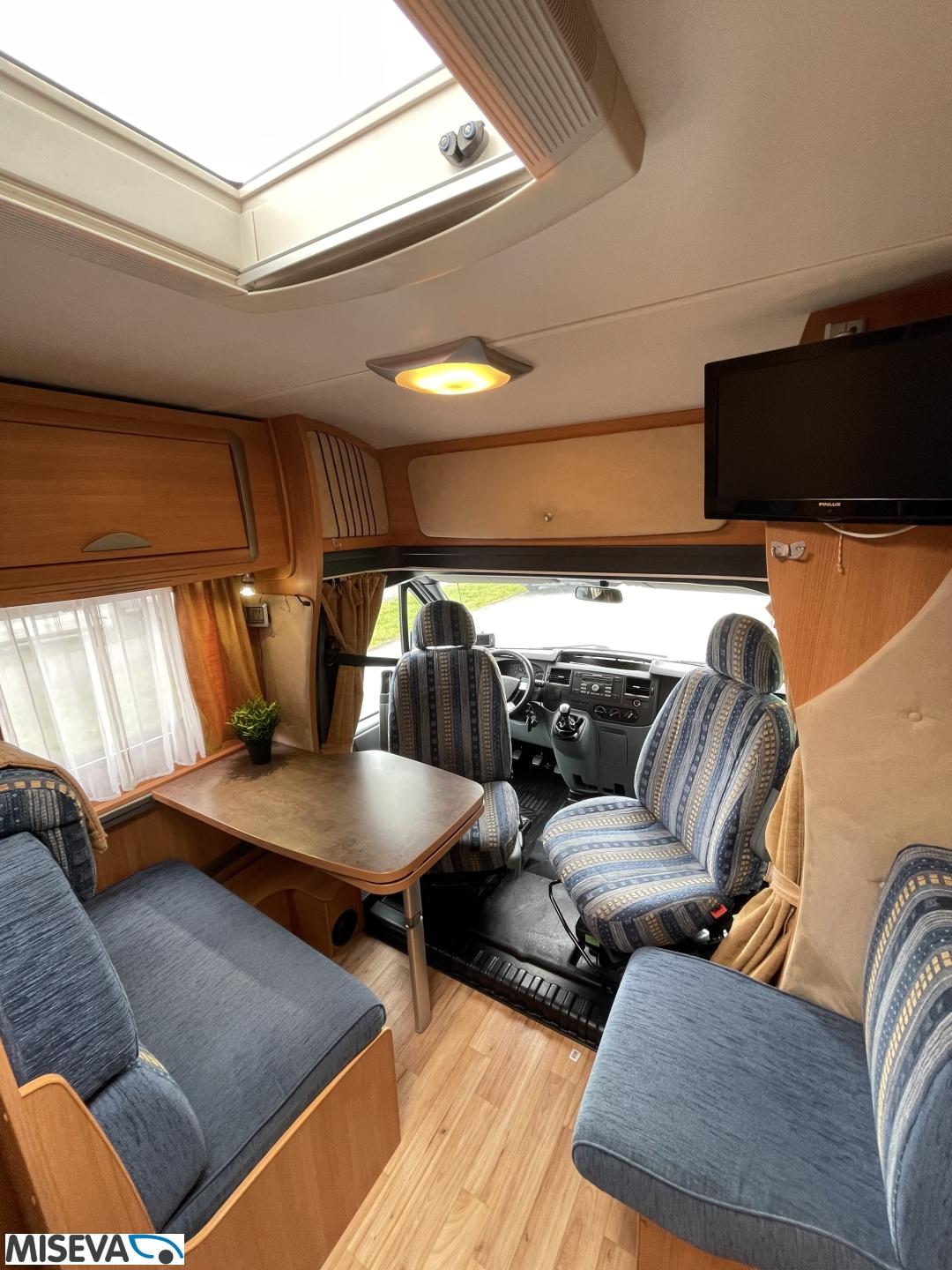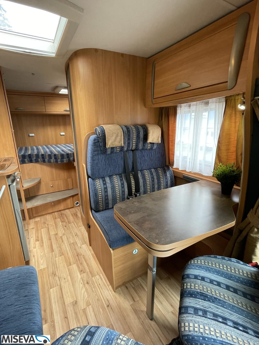 Lyhyt matka-auto ilmastoinnilla vaikka jokapäiväiseen ajoon. Poikittainen parivuode takana, jonka korkeus kätevästi säädettävissä. Edessä pöytäryhmä viidelle kääntyvin ohjaamon istuimin. Keskellä keittiö ja tilava pesuhuone.