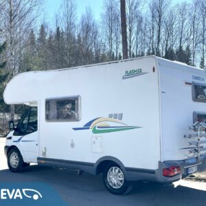 Näppärä, alle 6 m pitkä matka- auto jossa istuma- ja makuupaikat kuudelle.