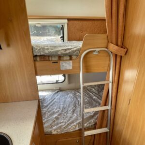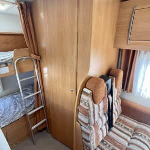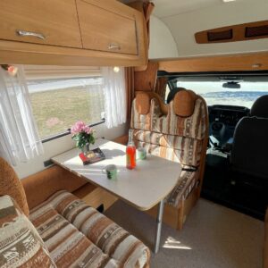 Auton takaosassa auton levyiset kerrosvuoteet joista alempi mahdollista kääntää pystyyn takatallin laajentamiseksi. Auton etuosasta löytyy leveä alkovivuode ja pöytäryhmä neljälle. Pöytäryhmä sijattaviss toiseksi parivuoteeksi.
