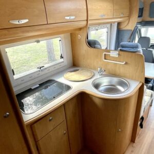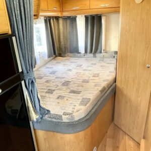 Avara ja valoisa pohjaratkaisu. Edessä tilava istuinryhmä kääntyvillä etuistuimilla sekä sivusohvalla, keskellä tilava L-keittiö sekä suuri uusi jääkaappi, takana valoisa wc& suihkutila sekä parivuode.