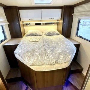 Auton takaosasta löytyy korkeussäädettävä saarekevuode, johon helppo nousta toista herättämättä. Alla läpilastattava takatalli ja takana myös erilliset suihku/ WC- tilat.