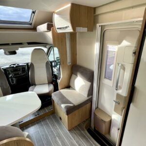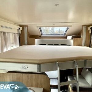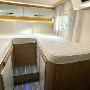 Takana pitkittäiset erillisvuoteet ja niiden alapuolella tilava takatalli. Keskellä WC/pesuhuonetilat erillisellä suihkutilalla. L-keittiö normaalilla keittiövarustuksella ja isolla jääkaapilla. Edessä tilava pöytäryhmä viidelle henkilölle ja sen yläpuolella sähköisesti alaslaskettava vuode kahdelle henkilölle.
