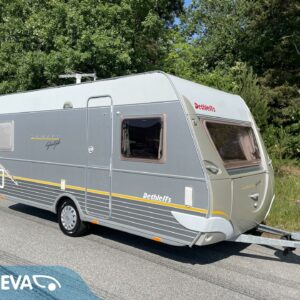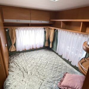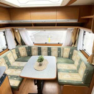 Kompakti Aldellinen vaunu, kauniilla ulkonäöllä. Takana parivuode pitkittäin, wc-tila vieressä. Keskellä keittiö. Edessä u-pöytäryhmä.